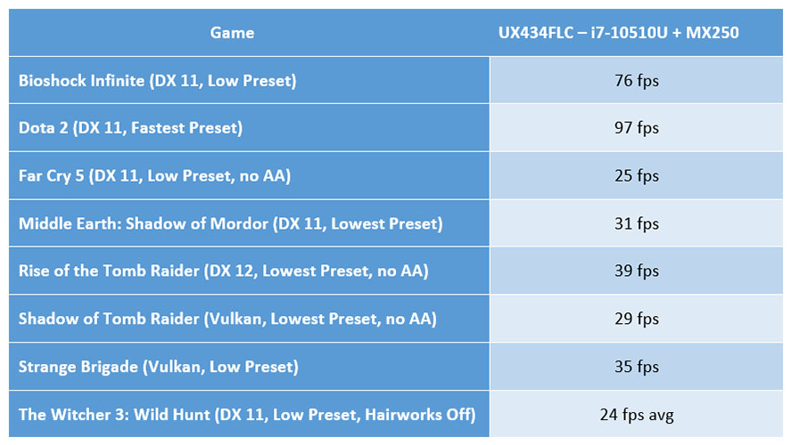 قمنا بتشغيل اثنين من عناوين DX11 و DX12 و Vulkan على ملف تعريف Auto / Best Performance، مع تشغيل المراوح على Auto، وبدقة FHD وإعدادات رسومات منخفضة. وكان هذا ما حصلنا عليه:
