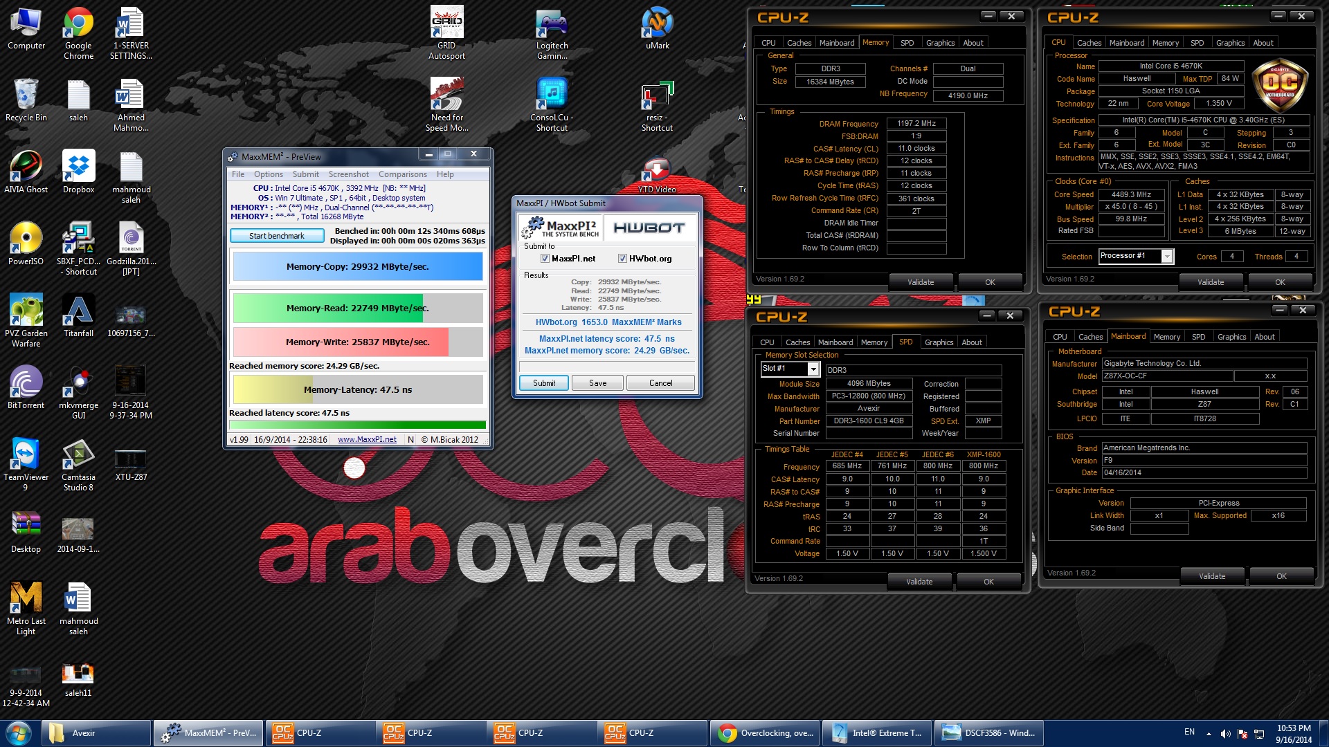 وأما فيما يخص عملية كسر السرعة فقد إستطعنا الوصول إلى تردد 2400Mhz بالذواكر بفولت 1.65 وبتواقيت CL11 12-11-12 وهو أمر غاية في الروعة إذا أخذنا في الأعتبار ترددها الأساسي 1600MHz, وكانت الذواكر تستجيب بشكل رائع مع كل الترددات التي تقع ما بين تردد 1600 وصولاً إلي 2400 بل وكان الحصول علي تواقيت أفضل أمر ممكن. قمنا بإختبار الذواكر عند تركيب قطعتين أى بحجم 8GB و أربع قطع أى بحجم 16GB كل منها على الترددات القياسية وأيضآ مع كسر السرعة ونعتذر عن عدم وجود ذواكر أخري للمقارنه لكن قريباً ستتوالي مراجعات الذواكر وسيختلف الأمر تماماً إن شاء الله. والصورة بالأسفل تُظهر عميلة كسر السرعة
