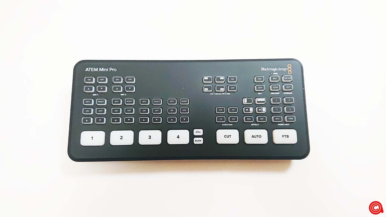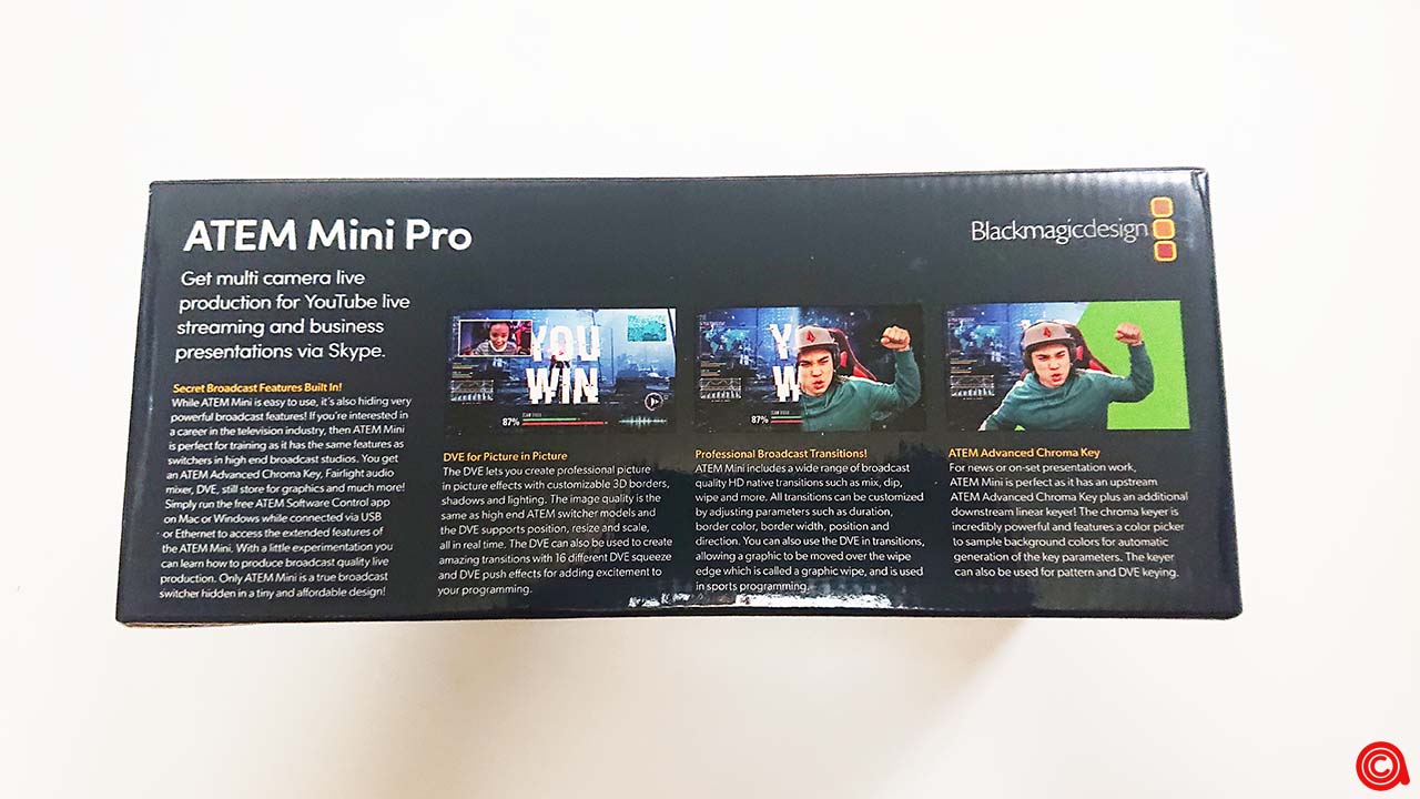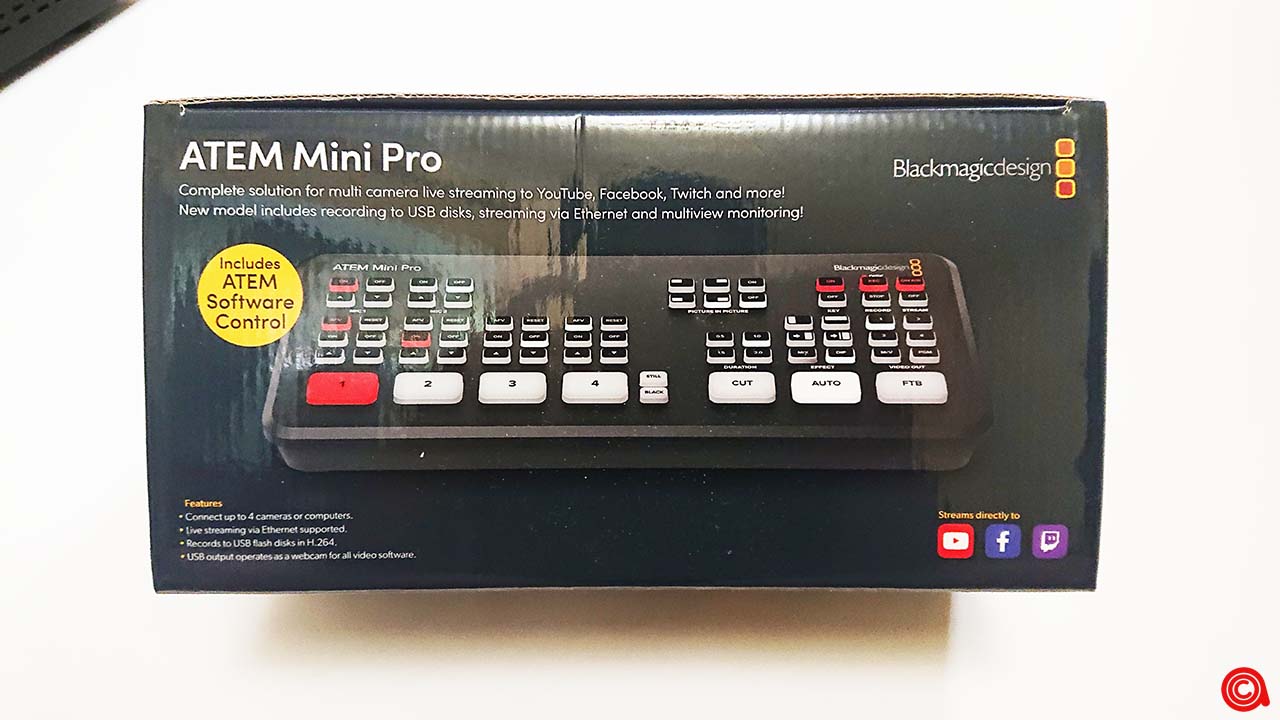 يأتي جهاز ATEM Mini Pro من شركة Blackmagic Design في علبة من الكارتون المقوى متوافقة من حجمه، وتحتوي في الجهة العلوية على صوارة كاملة للجهاز، مع ذكر ابرز خصائصه.