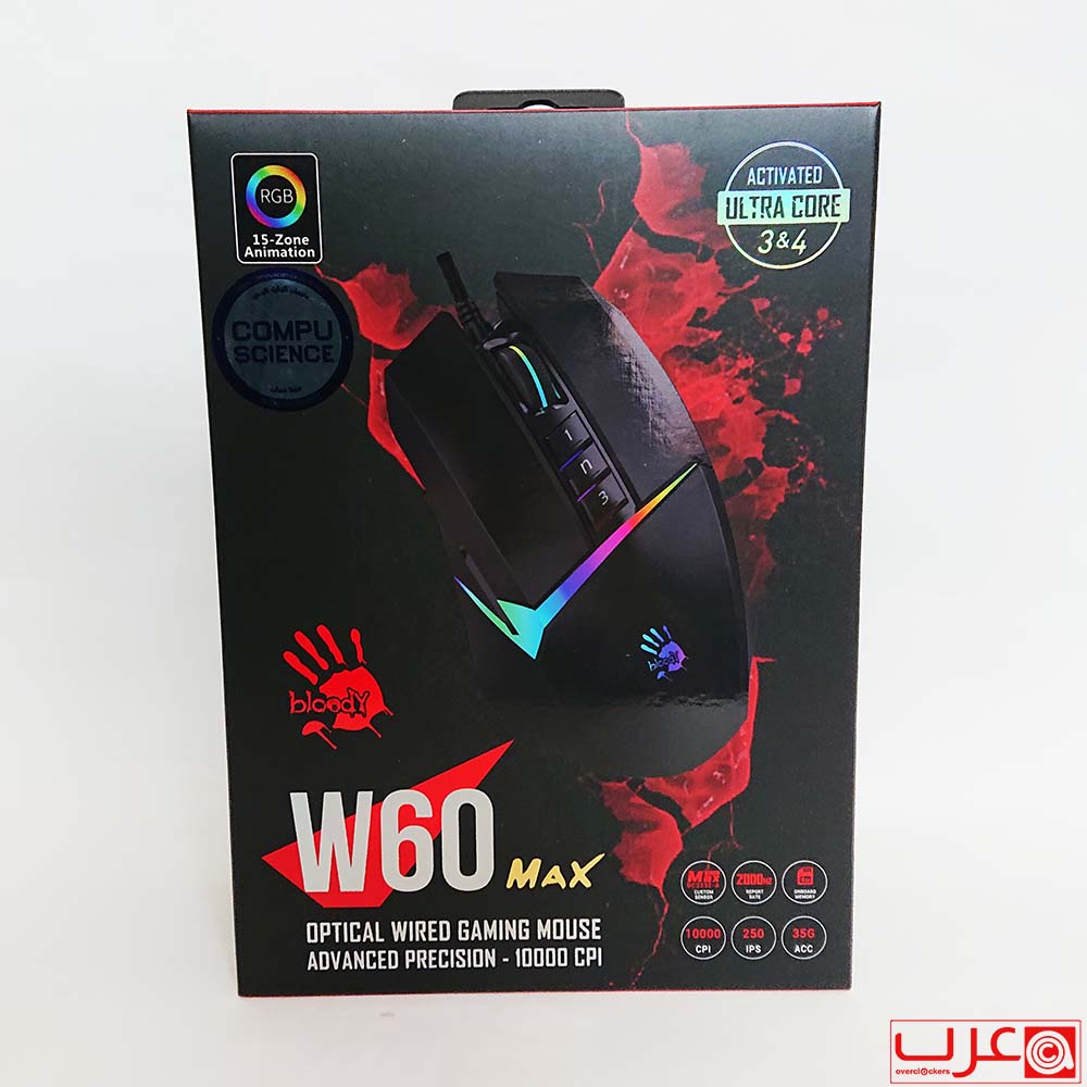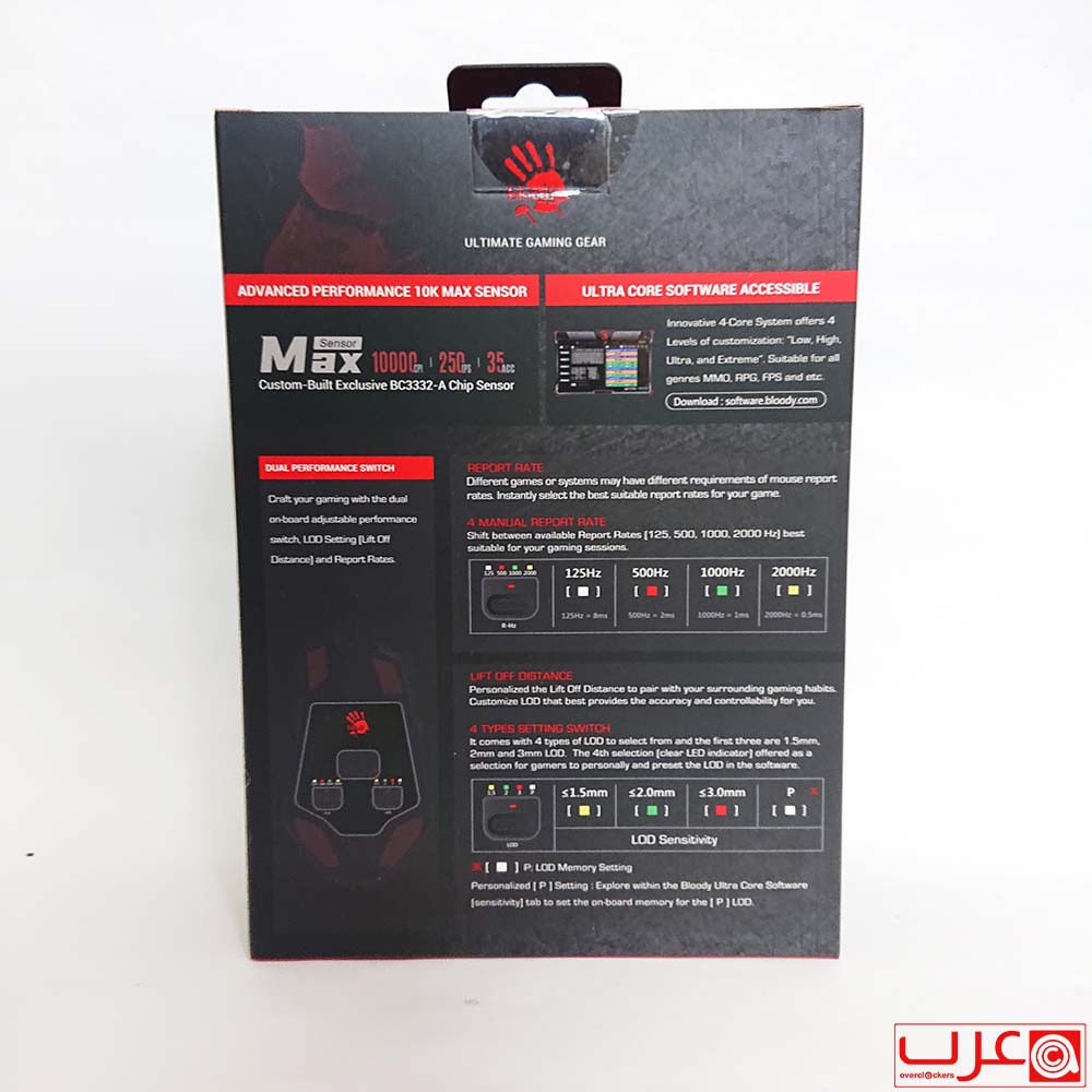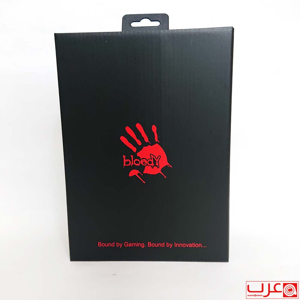 تأتي الفأرة في صندوق كبير الحجم يغلب عليه اللون الاسود مع شعار Bloody باللون الاحمر وصوة كبيرة للفأرة، ونرى اسم الموديل بحجم كبير مع ذكر لابرز المزايا بالاضافة الى ذكر ان هناك 16 منطقة تعمل باضائة RGB.