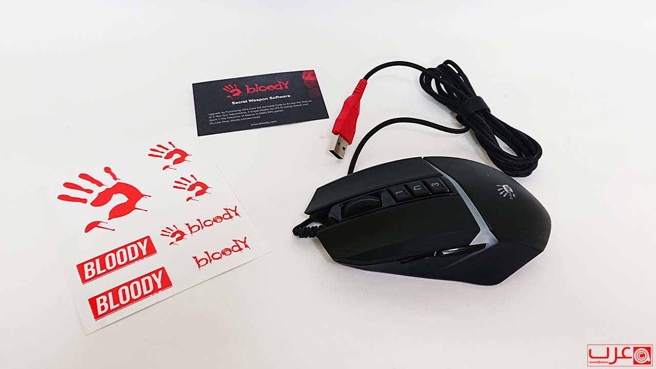 بعد اخرجها من العبوة، تميل Bloody إلى حزمة صغيرة جدا مع منتجاتهم. حيث توجد الفأرة نفسها، ومجموعة من الملصقات بالاضافة الى بطاقة لتحميل برنامج التشغيل.