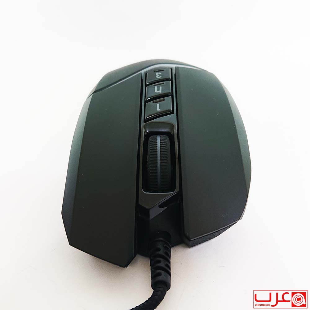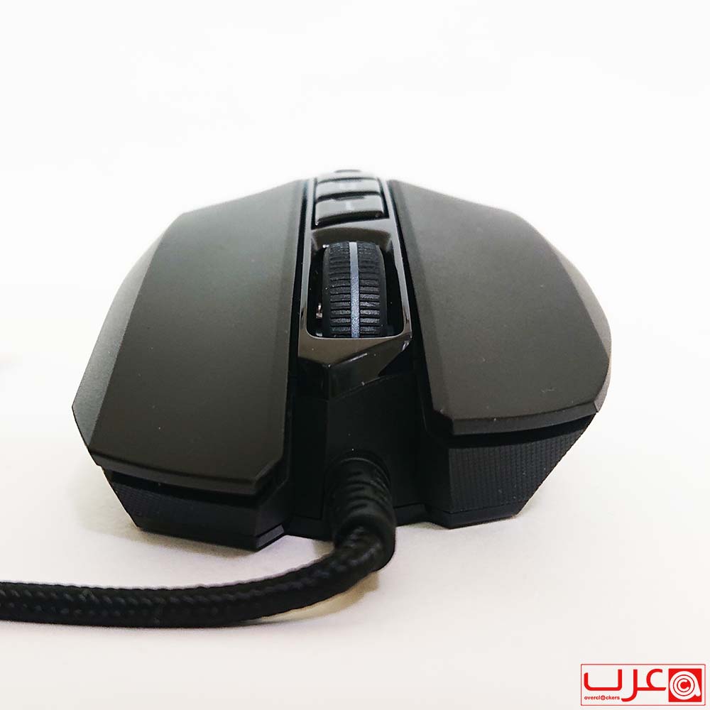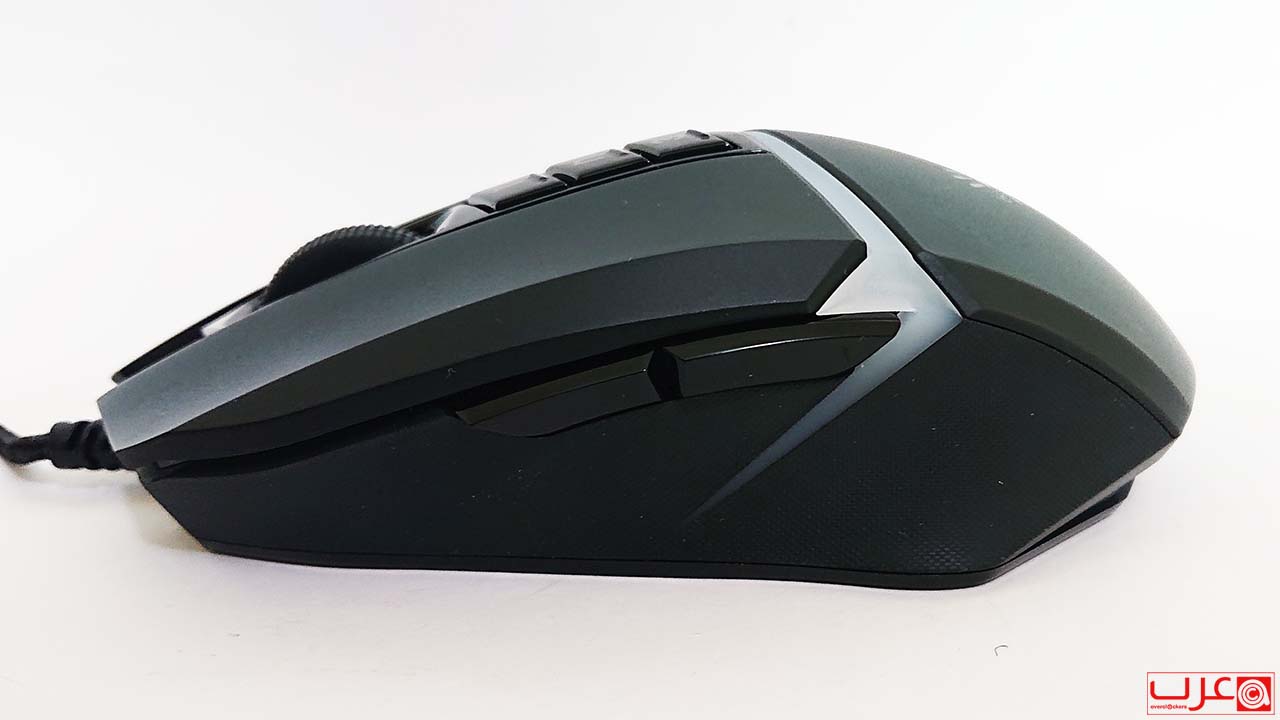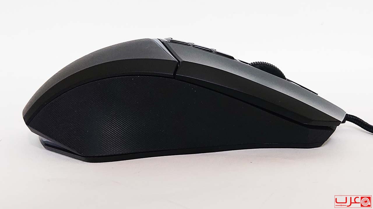 الجانب الايسر للفأرة يحمل نفس تصميم الزوايا الحادة حتى المنطقة الخاصة باضائة RGB، مع ملمس مطاطي يمتد على كل الجانب. يوجد أيضًا زوج من أزرار الإبهام الكبيرة التي يمكن تهيئتها داخل البرنامج.