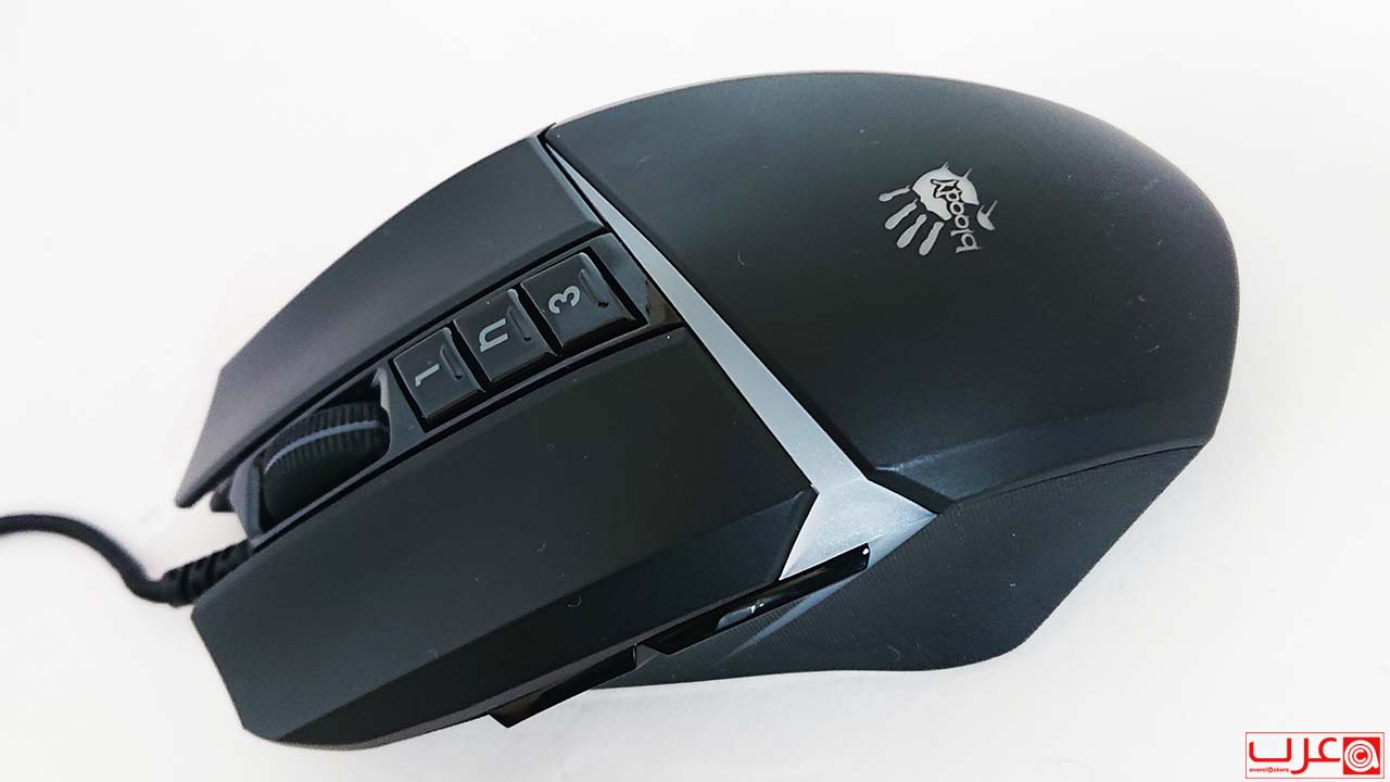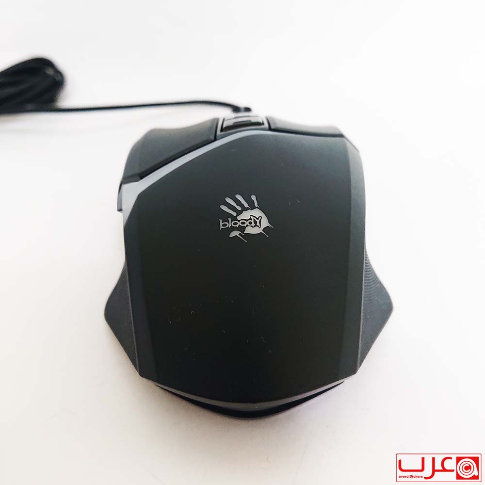 ومن الخلف يظهر الشكل التناظري للفأ{ة وفي الوسط شعار Bloody الذي يضيئ بالوان متعددة RGB.