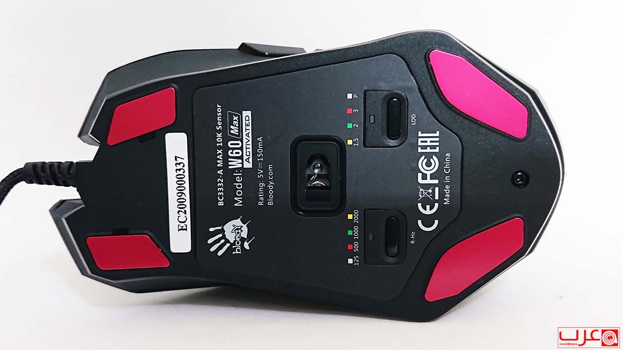 ويوجد في أسفل الفأرة وسائد XGlide المعدنية الممتازة التي توفر انزلاقًا ممتازًا وتمتاز بلونها الاحمر. وقد تم زرع مستشعر BC3332-A بشكل مثالي تقريبًا في وسط الفأرة. بالاضافة الى سويتشات التخصيص في المنطقة السفلي وتتميز بازرار خفيفة الضغط.