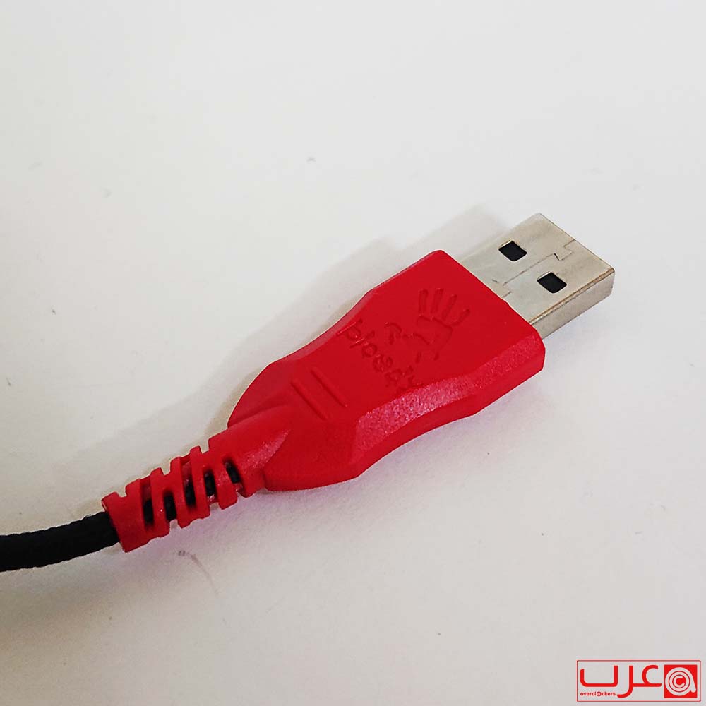 وأخيرًا، بالانتقال إلى الكابل. فقد اختارت Bloody استخدام كابل مضفر. وتبدو النهاية الكبيرة بلونها الاحمر وشعار الشركة لطيفة ومنسجمة حتى تساعدك على إخراجها من منافذ USB. الكابل نفسه يأتي بطول 1.8 متر.