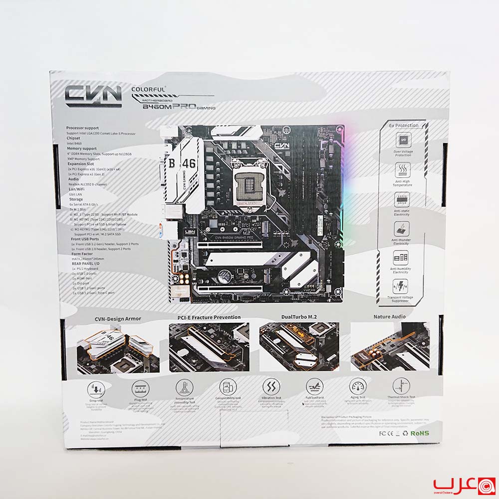 تصل لوحة CVN B460M Pro Gaming في صندوق كرتوني مخصص للبيع بالتجزئة ويمكن وصفه انه مشابه لمعظم اللوحات الأم لسلسلة الألعاب. يبدو تصميم الصندوق بسيطًا جدًا بالنسبة لمنتج ألعاب، والذي عادة ما يصرخ لنا بألوان زاهية وميزات رئيسية. لقد تعودت على رؤية تغليف اللوحات الأم ذات العلامات التجارية الأخرى بتصميم أكثر حيوية. الأهم هنا هو ما بداخل الصندوق.