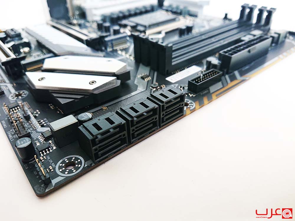 يتوفر أيضًا منفذ توصيل USB 3.2 Gen1 خارجي على اللوحة. كما تحتوي اللوحة على ستة منافذ SATA 6.
