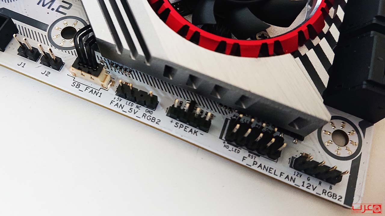 ولا تحتوي CVN X570M Gaming Frozen V14 على ازرار تشغيل وبدء سريع DIY هذه المرة، لذلك تحتاج إلى استخدام توصيل كابلات الصندوق لتشغيلها. بجانب اسنان توصيل الازرار يوجد منف توصيل مروحة تقليدي. كما تحتوي اللوحة على ستة منافذ SATA 6.