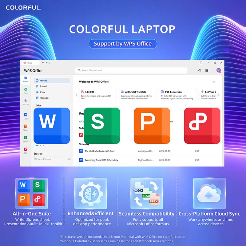 إلى جانب الأداء المخصص للألعاب والإبداع، تأتي السلسلة مزودة مسبقًا بحزمة WPS Office المتوافقة بالكامل مع صيغ Word وExcel وPowerPoint، مما يجعلها مناسبة للاستخدام الأكاديمي والمهني اليومي بسلاسة عبر مختلف المنصات.