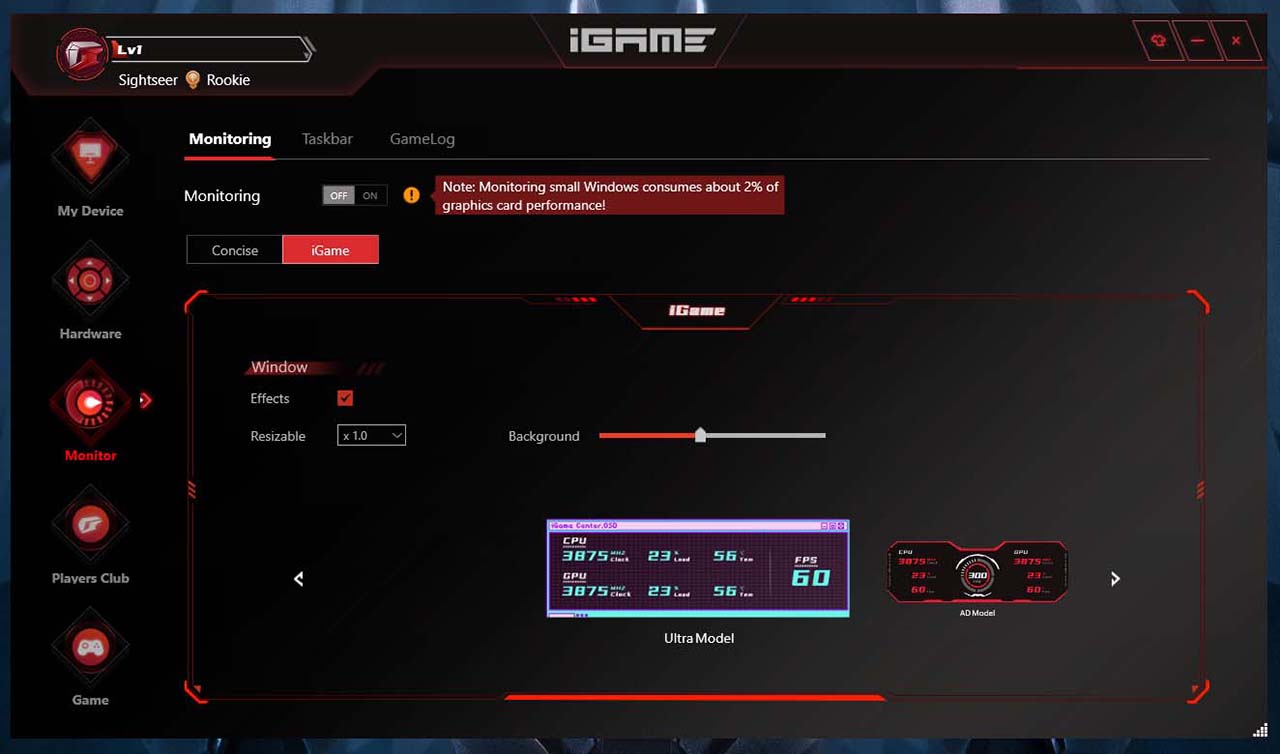 تأتي بطاقة COLORFUL iGame GeForce RTX 4070 SUPER Ultra W OC 12GB-V مع – أو بالأحرى متوافقة مع برنامج iGame القابل للتنزيل. هذا برنامج AIO مبهج المظهر لبطاقات الرسومات واللوحات الأم المختلفة من COLORFUL.