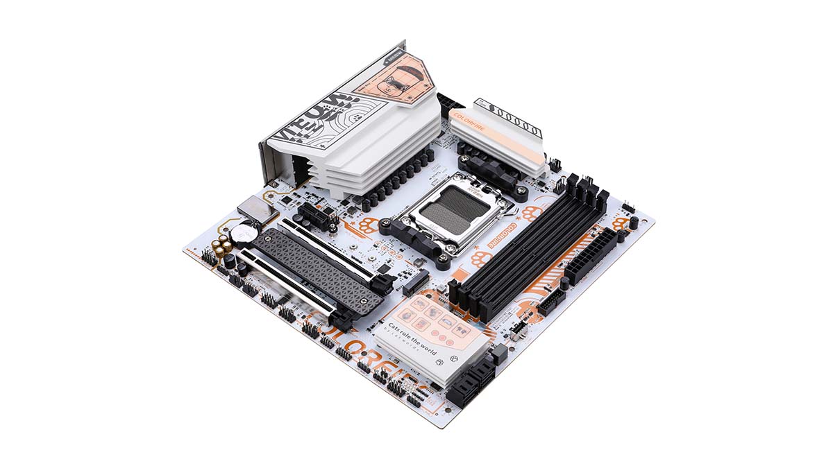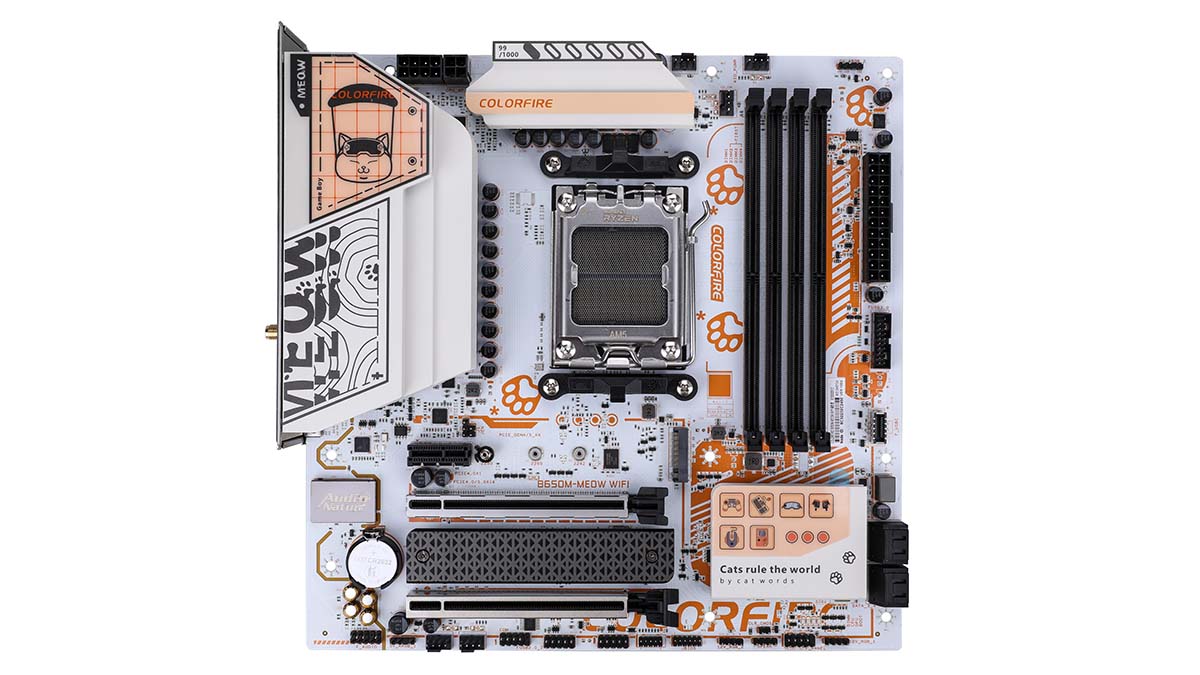 تتبنى اللوحة الأم COLORFIRE B650M-MEOW WIFI تصميم وألوان القط البرتقالي Bobi مما يجعل من السهل تنسيق الألوان مع مكونات سلسلة COLORFIRE MEOW الحالية. تعد اللوحة الأم COLORFIRE B650 MEOW مثالية لمحبي AMD ومحبي القطط على حد سواء!