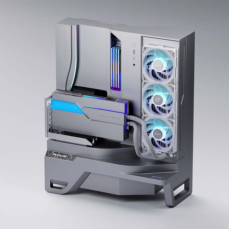 يُقدّم هيكل iGame Neptune الجديد، المُتكامل، تصميمًا تبريديًا مُبتكرًا من خلال تجميع مُشعّات وحدة المعالجة المركزية ووحدة معالجة الرسومات. يُحسّن هذا التصميم المظهر الخارجي للجهاز من خلال إنشاء نظام تبريد مُزدوج مُدمج بقطر 360 مم، مما يُتيح تصميمًا أكثر تكاملًا وانسيابية. يهدف التصميم أيضًا إلى توفير تجربة استخدام أنيقة وفعّالة وظيفيًا لعُشّاق أجهزة الكمبيوتر عالية الأداء.