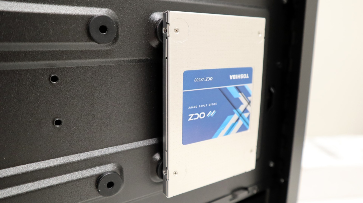 بالإضافة إلى محرك الأقراص M.2 SSD الخاص بنا، قمنا أيضًا بتثبيت عدد قليل من محركات أقراص SSD مقاس 2.5 بوصة. تم تركيبها على الجهة الخلفية من درج اللوحة الأم، ونحب حقًا طريقة التثبيت التي تقدمها Cooler Master لمحركات الأقراص في هذه الحالة. فكما هو موضح أدناه، يتم توفير الحلقات المطاطية ويمكن تثبيتها بسهولة في فتحات التثبيت المتوفرة، والتي سيتم استخدامها بعد ذلك لتثبيت محركات الأقراص في مكانها.