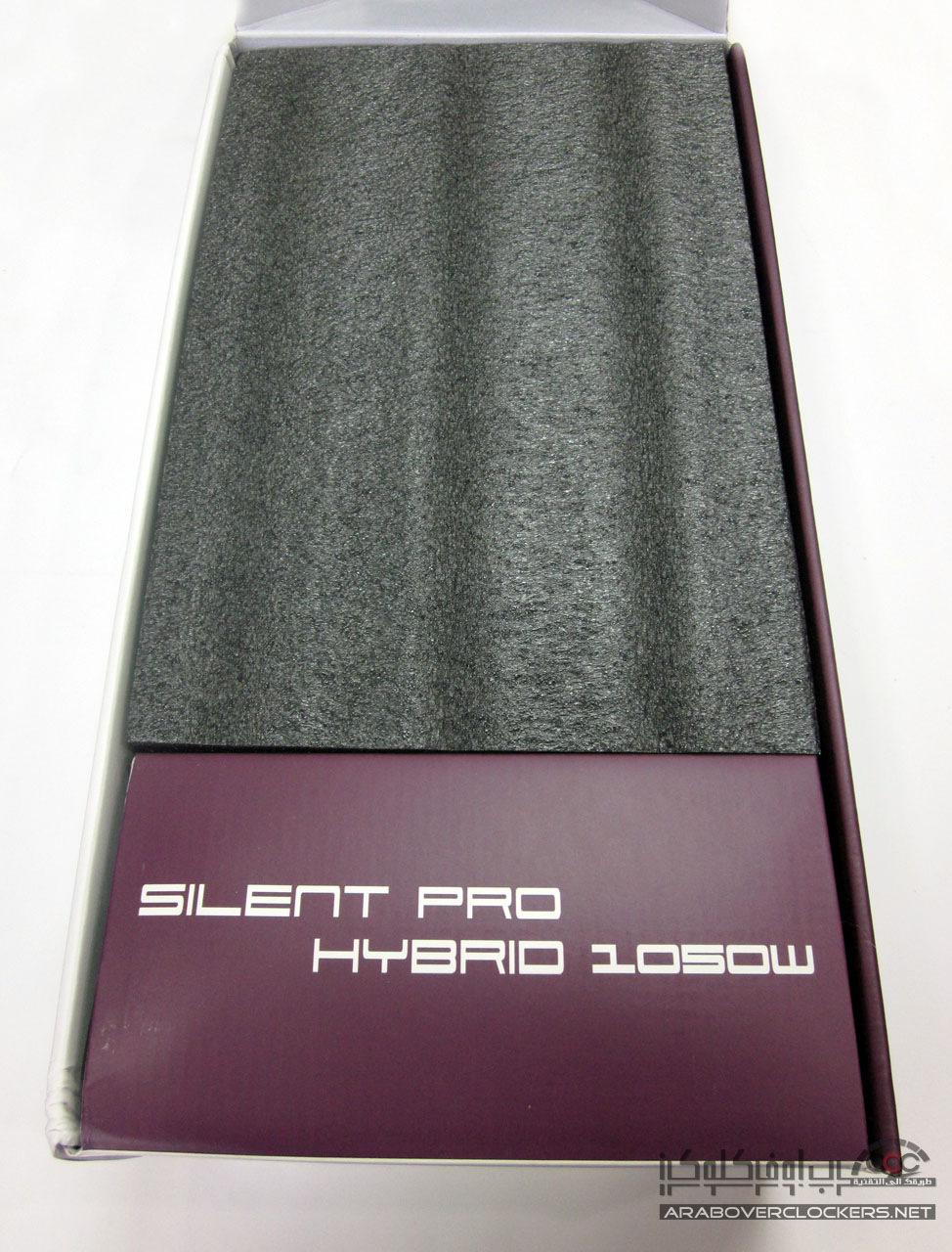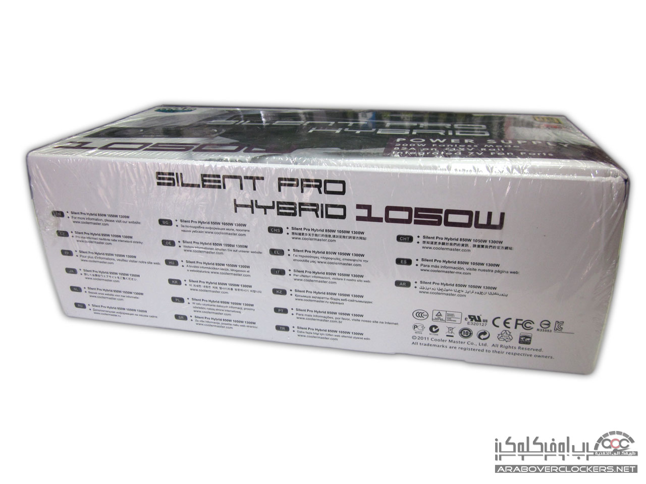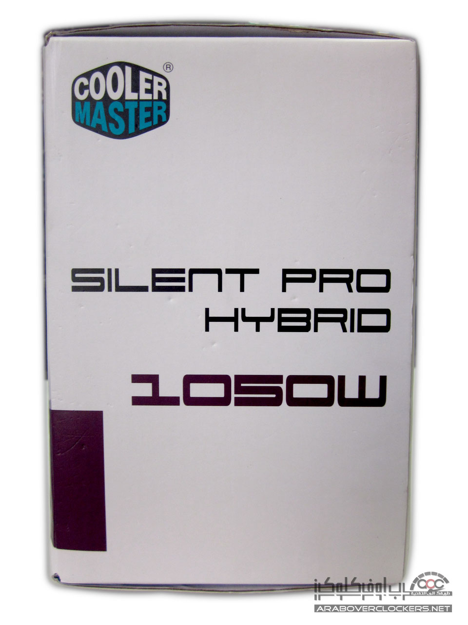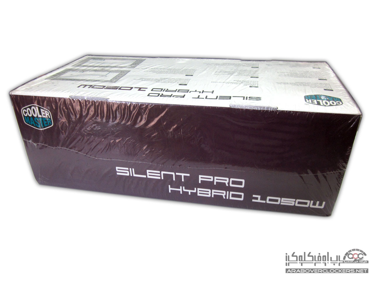 يأتي المزود Silent Pro Hybrid 1050W بنفس التغليف الأعتيادي الذي تعودنا ان نراه مع مزودات شركة كولر ماستر بتصميم يضم اللونين الأبيض والارجواني white and Purple…ونرى واجهة التغليف تضم صورة للمزود ومتحكم المراوح المرفق معه ومن الجهة الخلفية نرى بعض الخصائص العامه للمزود بعدة لغات مع رسم توضيحي لأداء مروحة وقدرة المزود