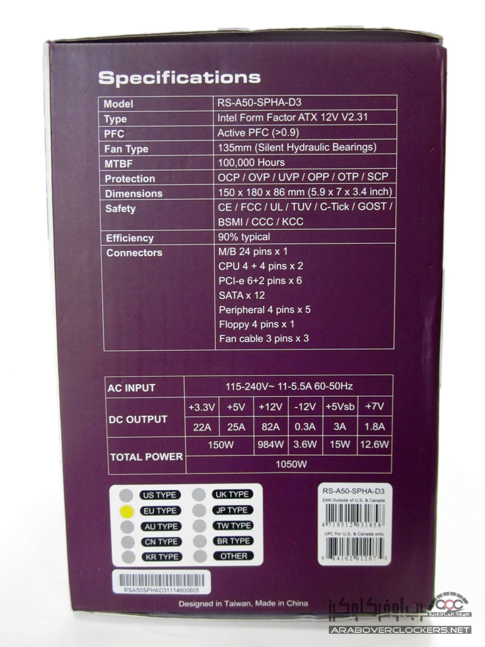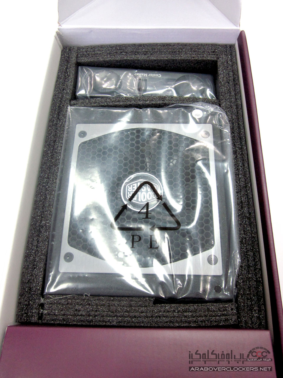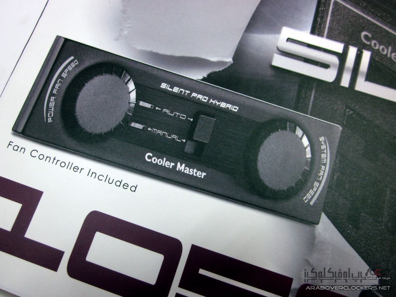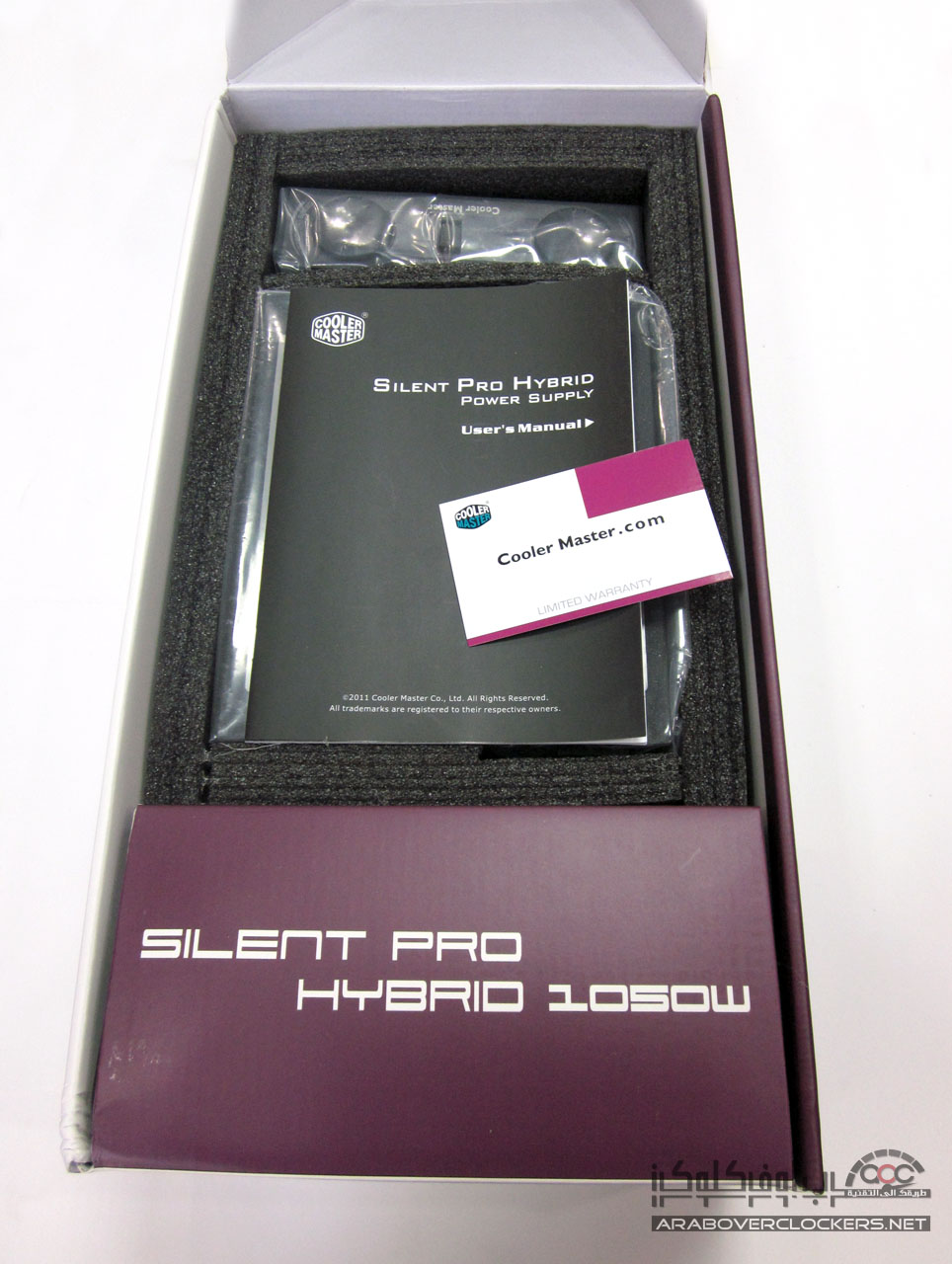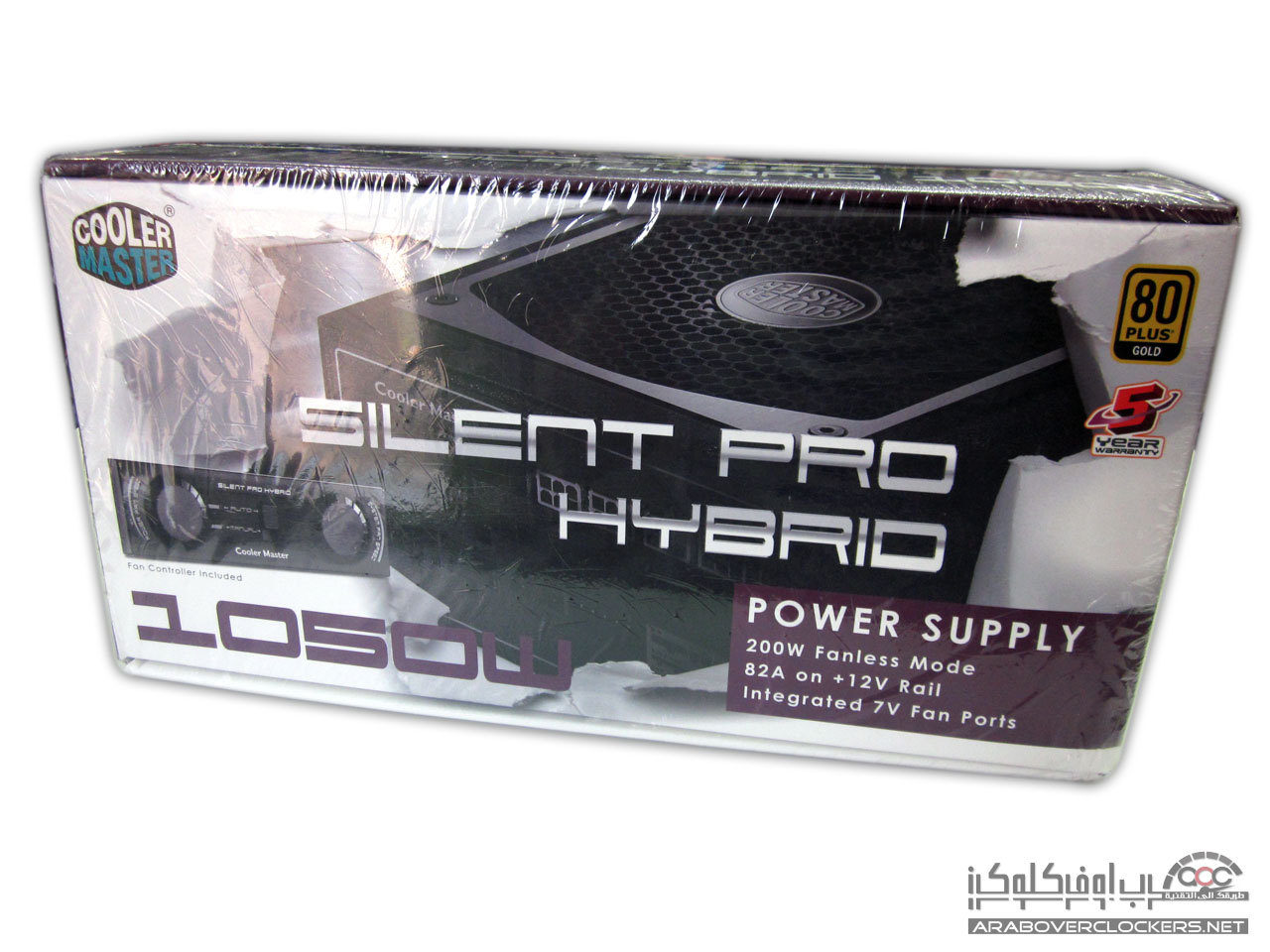 يأتي المزود Silent Pro Hybrid 1050W بنفس التغليف الأعتيادي الذي تعودنا ان نراه مع مزودات شركة كولر ماستر بتصميم يضم اللونين الأبيض والارجواني white and Purple…ونرى واجهة التغليف تضم صورة للمزود ومتحكم المراوح المرفق معه ومن الجهة الخلفية نرى بعض الخصائص العامه للمزود بعدة لغات مع رسم توضيحي لأداء مروحة وقدرة المزود