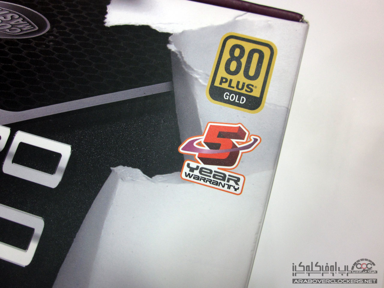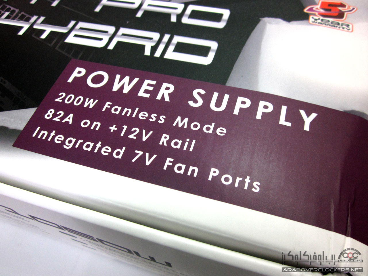 وعلى المقدمة نرى أيضا ذلك الجزء والذي يوضح بعض مميزات المزود مثل قدرة المزود على العمل حتى خرج معين (200 وات) بدون الاعتماد على مروحة التبريد مع توضيح قدرته على انتاج 82 امبير على خط 12v+ وأيضاً توضيح احتوائه على منفذين للمراوح بقدرة 7 فولت وبالجزء العلوي نرى الشعار الذي يرمز على تصنيف المزود في فئة 80PLUS