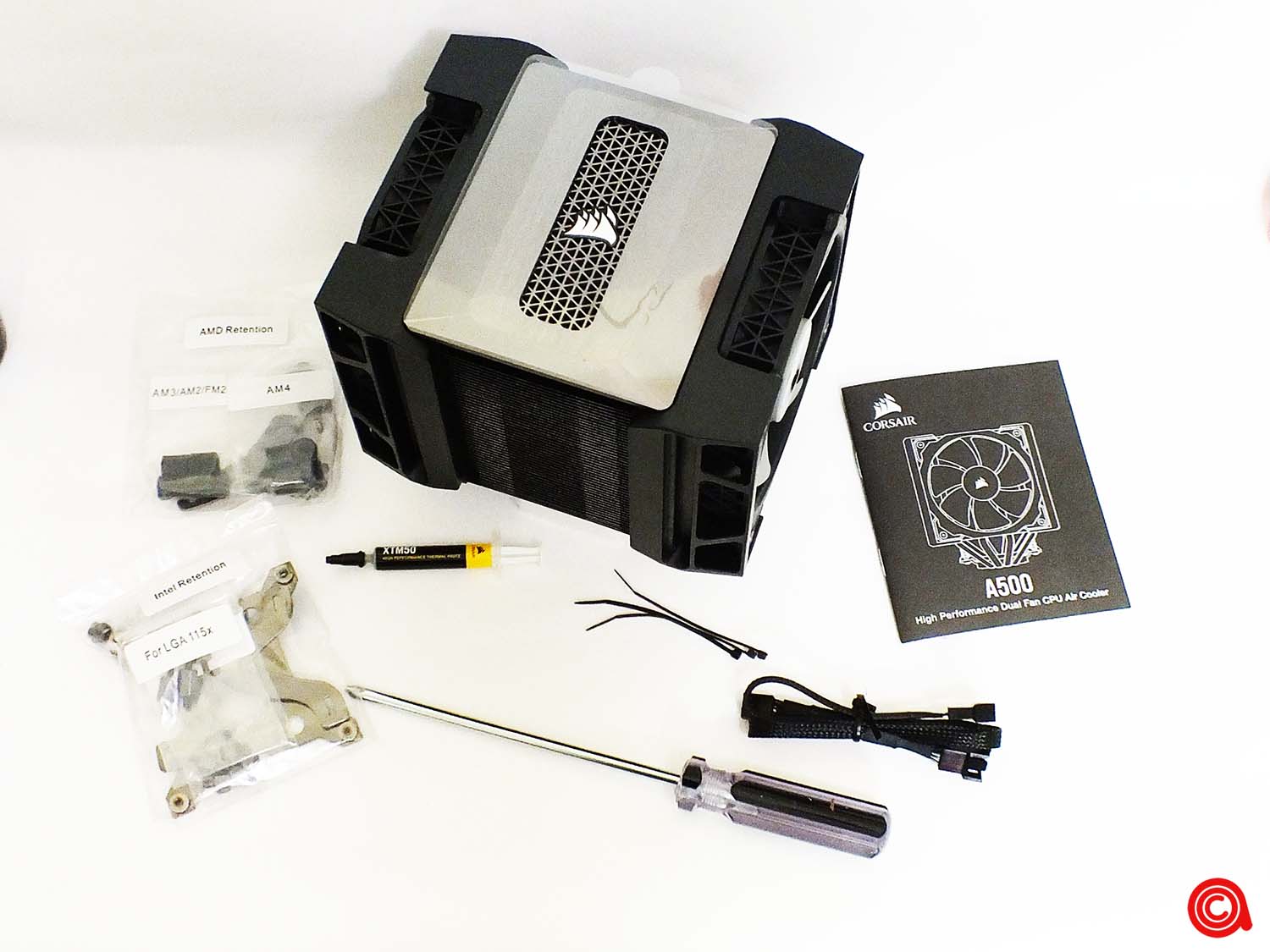 يأتي مع مشتت A500 جميع قواعد التثبيت التي تحتاجها لكل من مقابس Intel و AMD (على الرغم من عدم وجود دعم لـ AMD TR4)، وكابل تمديد مضفر للمرواح مروحة، وثلاثة أربطة للكابلات، والقليل من معجون XTM50 الحراري، وكتيب إرشادات وأخيراً مفك مألوف لتثبيت المشتت.