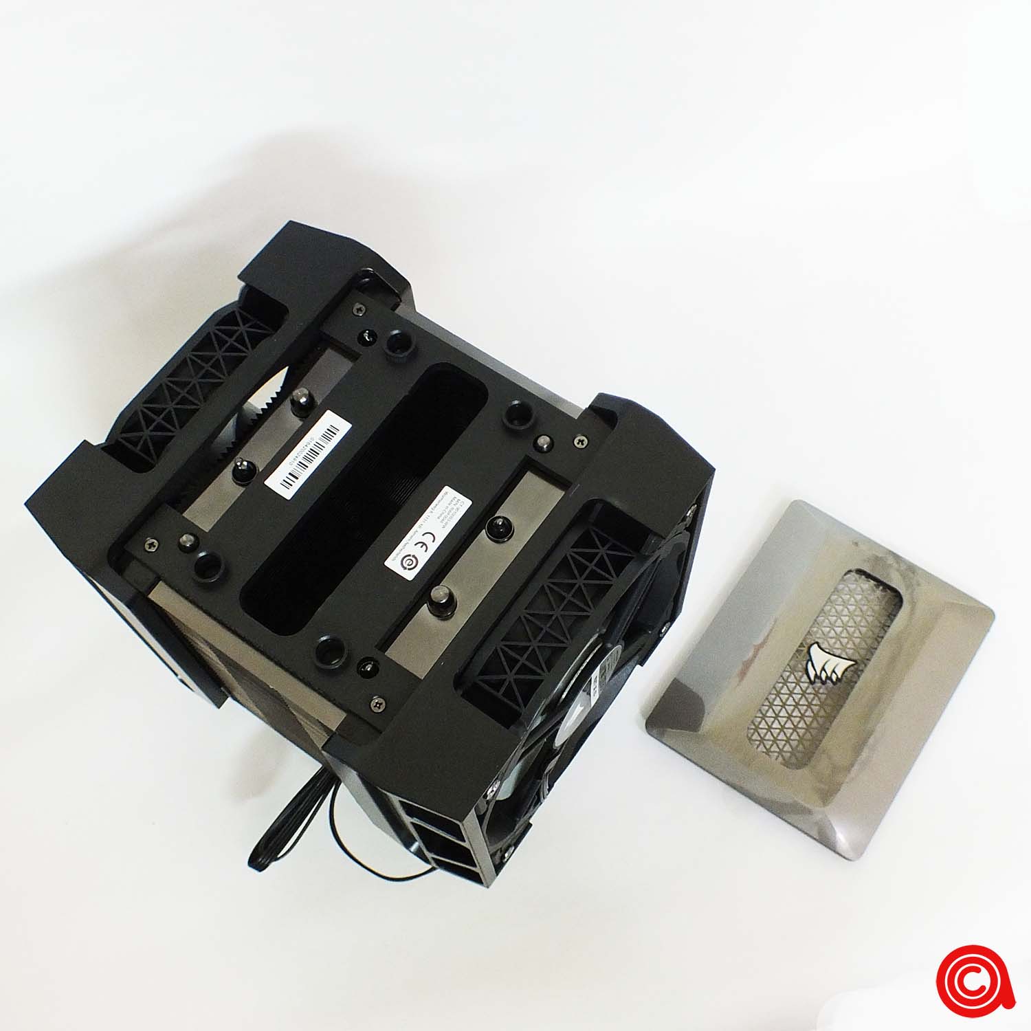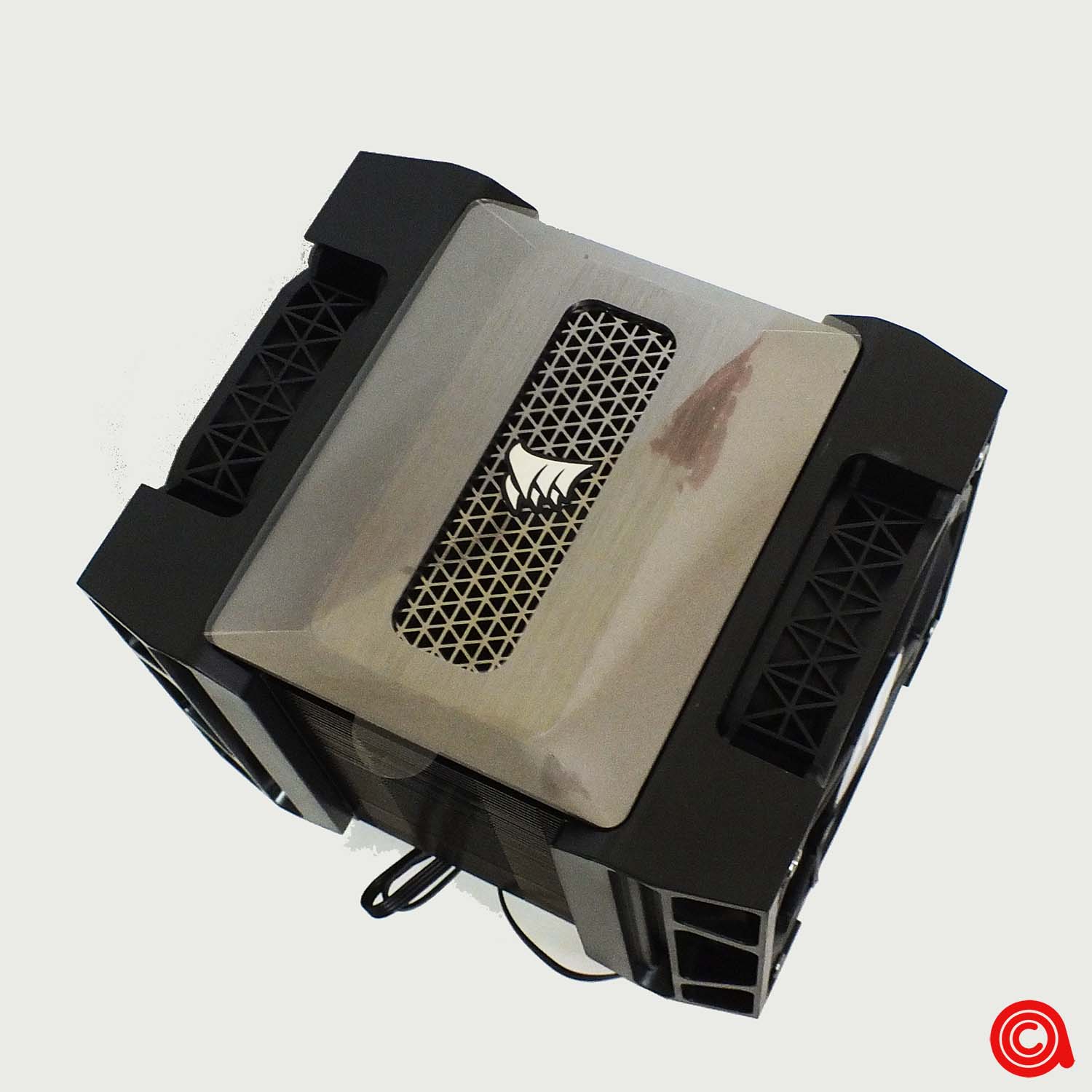 أعلى برج التبريد نجد غطاء معدني فاخر ومزين بشعار CORSAIR بارز في الوسط.
