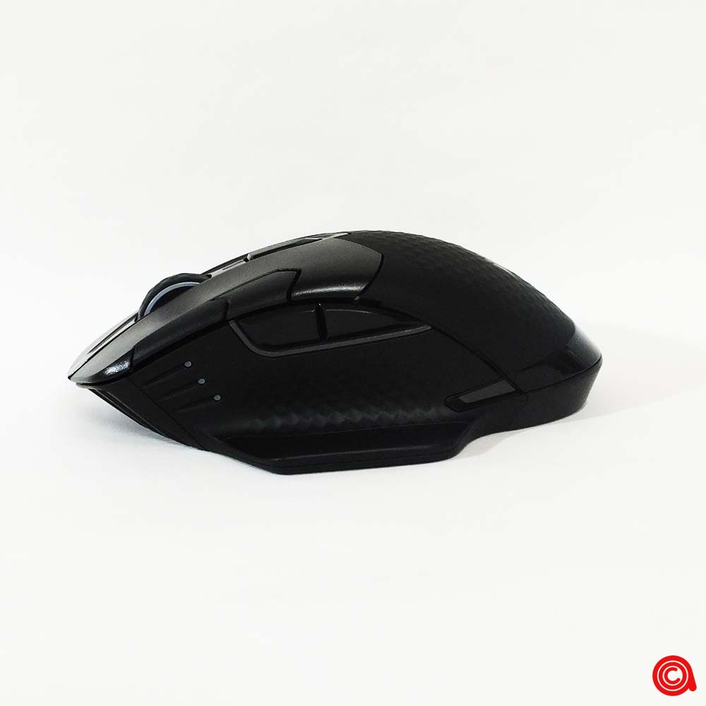 الجهة اليسرى للفأرة، حيث يوجد الإبهام، مجهزة بثلاثة مؤشرات LED لإظهار أوضاع مختلفة وإعدادات DPI. يوجد فوق الإبهام الأزرار النموذجية للأمام / الخلف التي يمكن تكوينها داخل البرنامج للقيام بأي شيء تقريبًا.