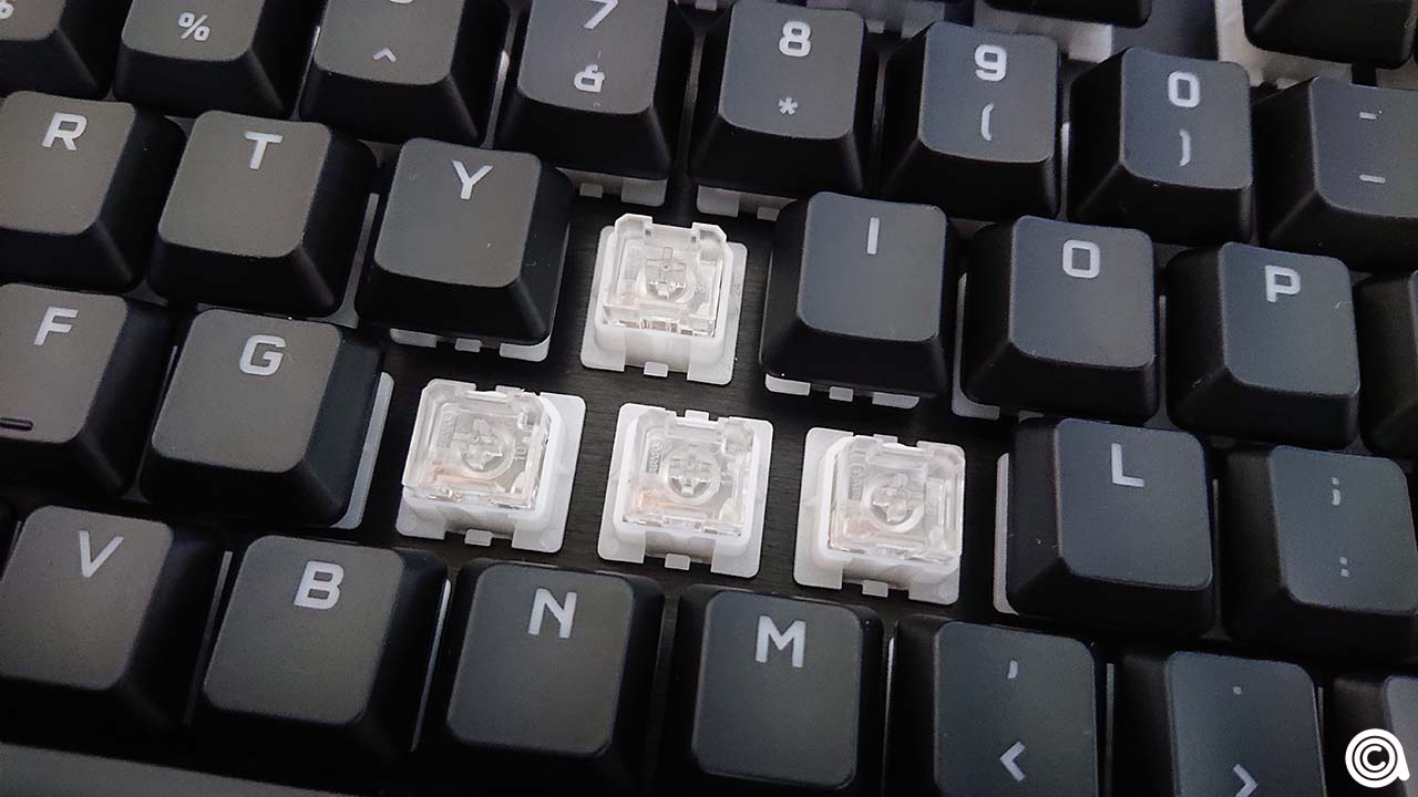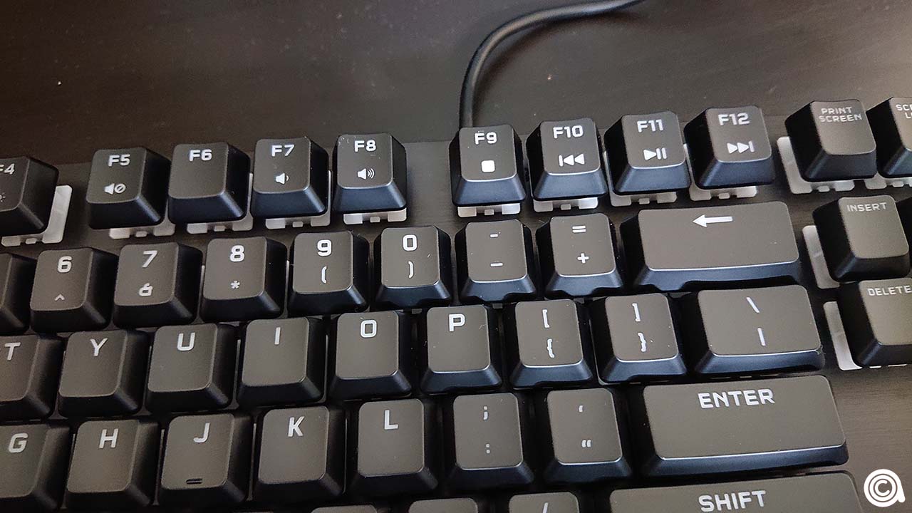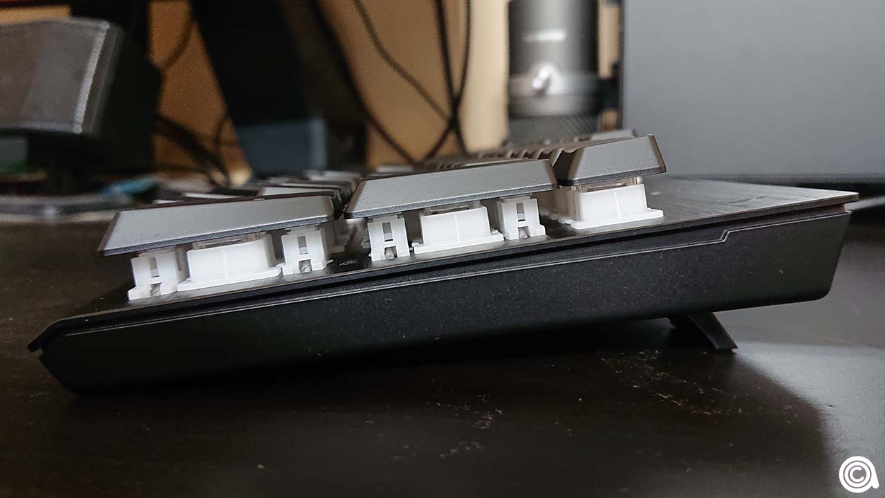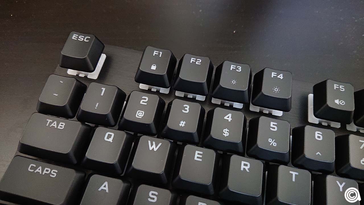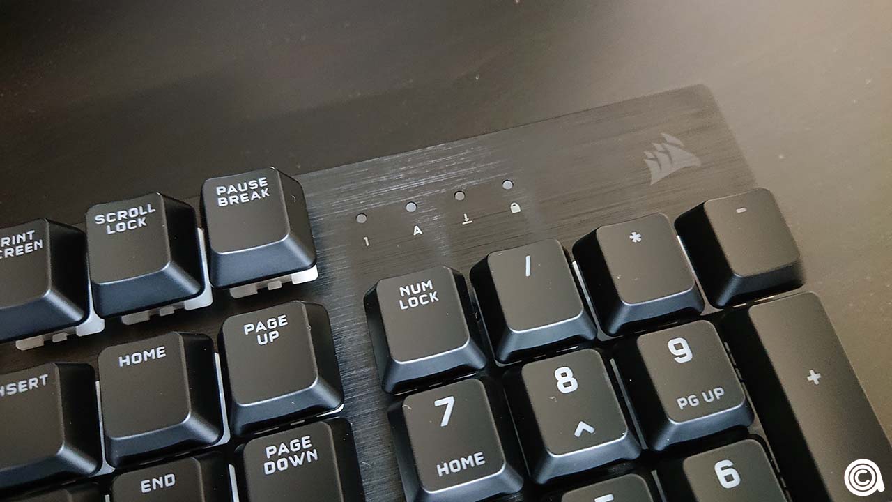 ومع ذلك تتضمن لوحة المفاتيح أربعة مؤشرات LED مثبتة في الإطار: Num Lock و Caps Lock و Scroll Lock و Windows Lock. يمكن تخصيص هذه الميزة الأخيرة ضمن إعدادات iCUE، ولكن بشكل افتراضي يقوم ببساطة بتعطيل مفتاح Windows لمنع مقاطعة اللعب بشكل عرضي.