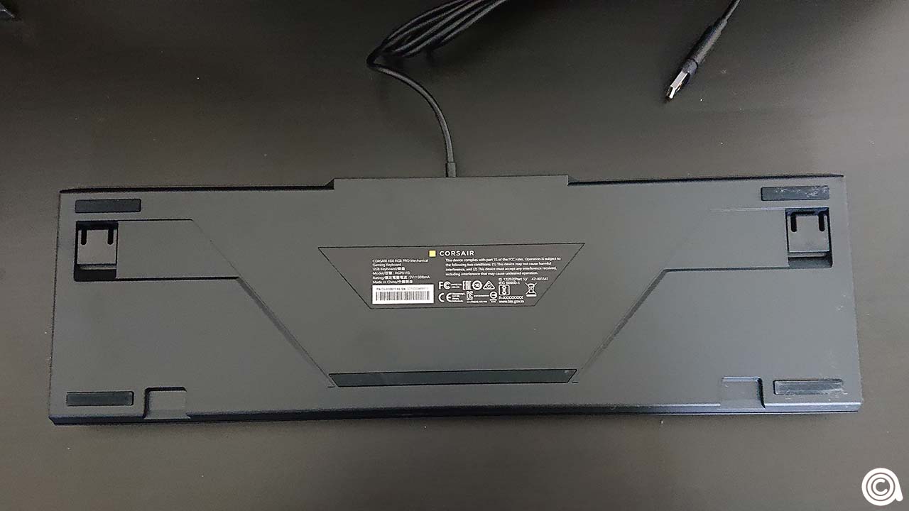 عند قلب لوحة المفاتيح، نجد أن K60 تتميز بأرضية بسيطة جدًا بدون حتى الزخارف المحدودة لـ K100. يوجد قدمان قابلان للطي على جانبي ملصق المنتج (يتضمن رقم المنتج والرقم التسلسلي ومعلومات الشهادة)، والجزء الاخر الوحيد البارز هو مستويين مقطوعين من الأرضية في المقدمة.