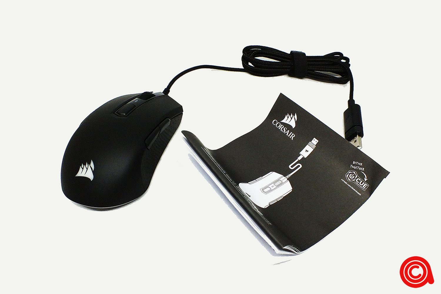 داخل العلبة، ليس هناك ملحقات اضافية، لكن Corsair ضمنت دليل البدء السريع، الذي يوضح كيفية الاستفادة من وظائف التوصيل والتشغيل في M55 RGB Pro.