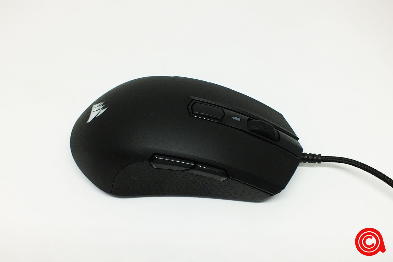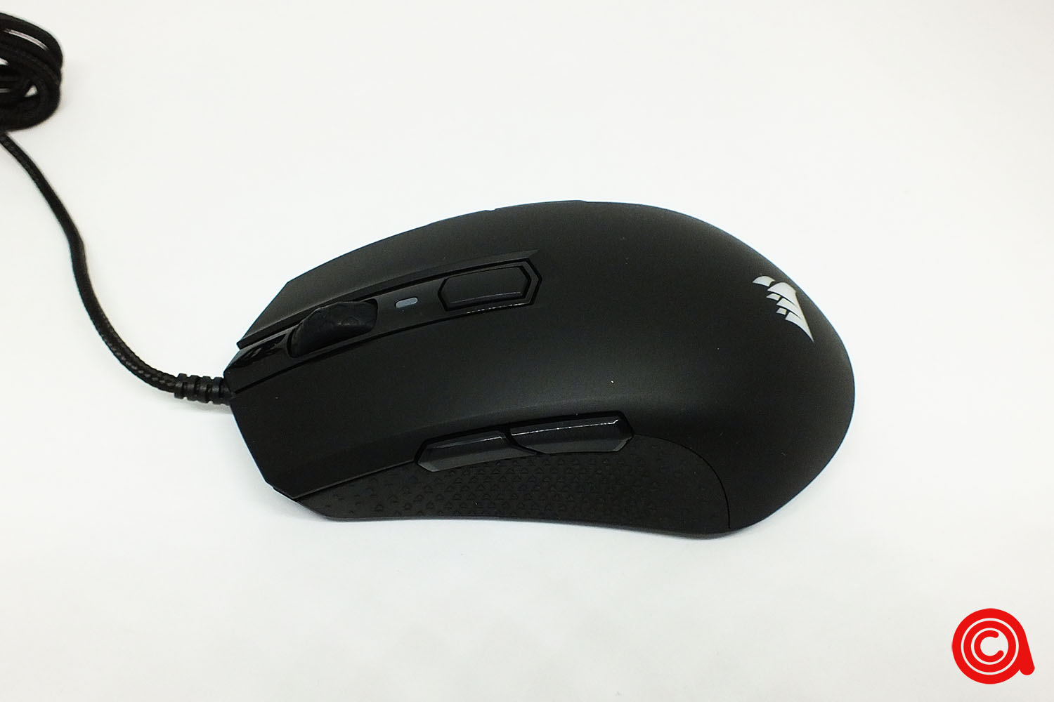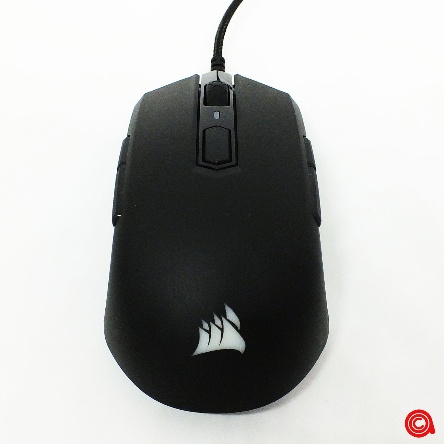 بالنظر مباشرة إلى الفأرة نجد ان Corsair قد ذهبت لتصميم بسيط جدا وغير معقد، حيث ترى فقط شعارها ومؤشر ال DPI ومنطقة ال RGB.