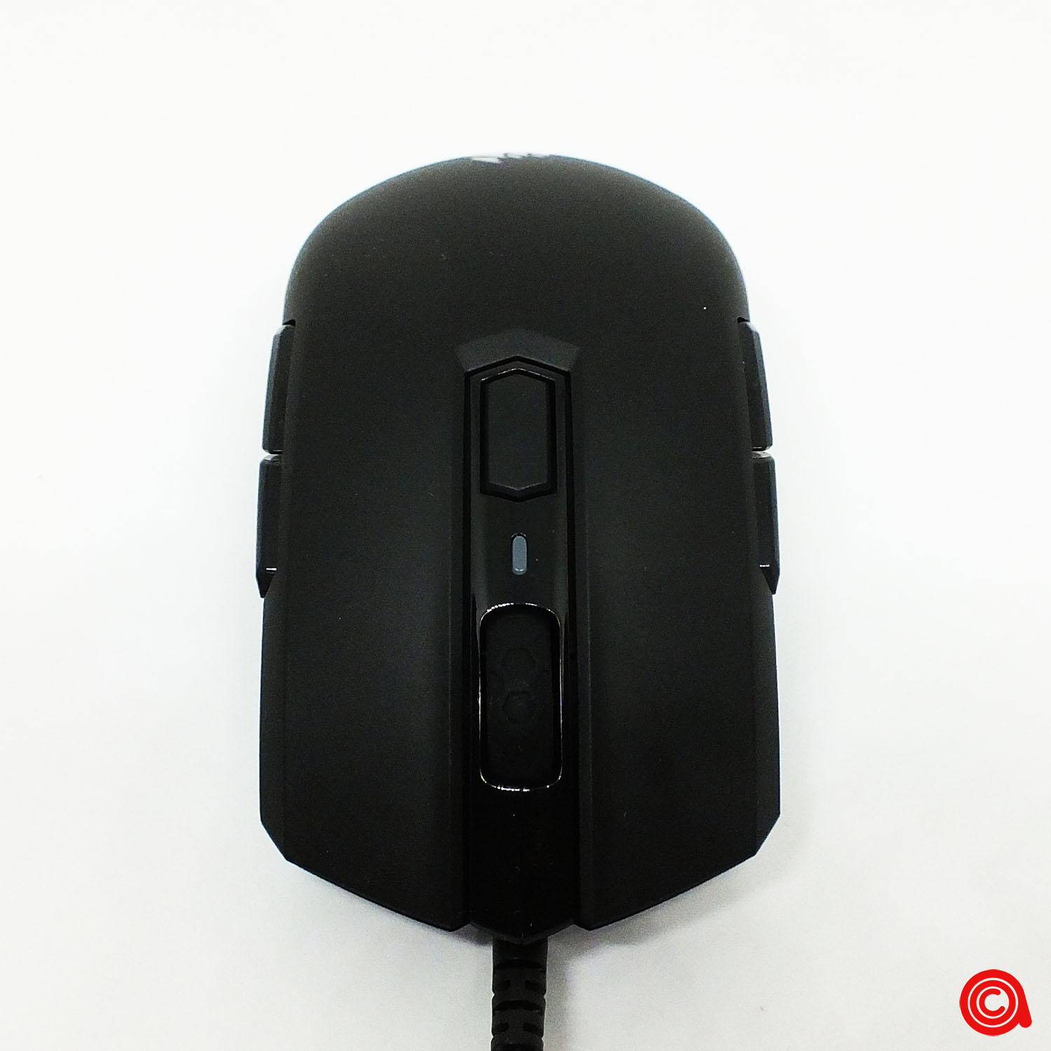 عند النظر إلى الفأرة من الامام نلقي نظرة أفضل على المقدمة الشبيهة بخلية العسل وهو الشكل الذي اعتمدته Corsair لفأرتها في الفترة الاخيرة.