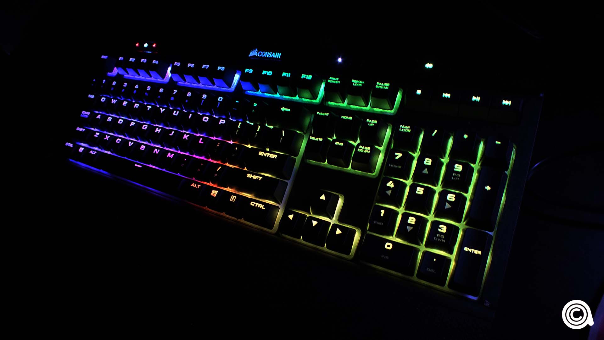 وبفضل هذه الخلفية البيضاء، خلف أغطية المفاتيح، تظهر إضاءة RGB بشكل اكبر من نظيرتها في لوحة K70 واللوحات الاخرى. وبفضل برنامج iCUE فإن تكوين تأثيرات الإضاءة الجميلة ليس من متعب أيضًا، فمع الكثير من الإعدادات المسبقة التي تبدو رائعة. تتميز STRAFE أيضًا بإضاءة على الحواف اليمنى واليسرى من لوحة المفاتيح، وأسفل الغطاء البلاستيكي. يمكن إضاءة هذا ضمن الإعدادات ولكن لا يمكن تهيئته إلا بإضاءة بيضاء – وهذا ما نراه ليس جيدا خصوصا مع التركيز الذي وضعته Corsair على المصابيح في مقدمة لوحة المفاتيح. ومع ذلك يمكن تبديلها وإيقافها بشكل مستقل عن بقية المفاتيح.