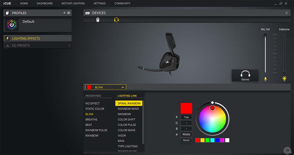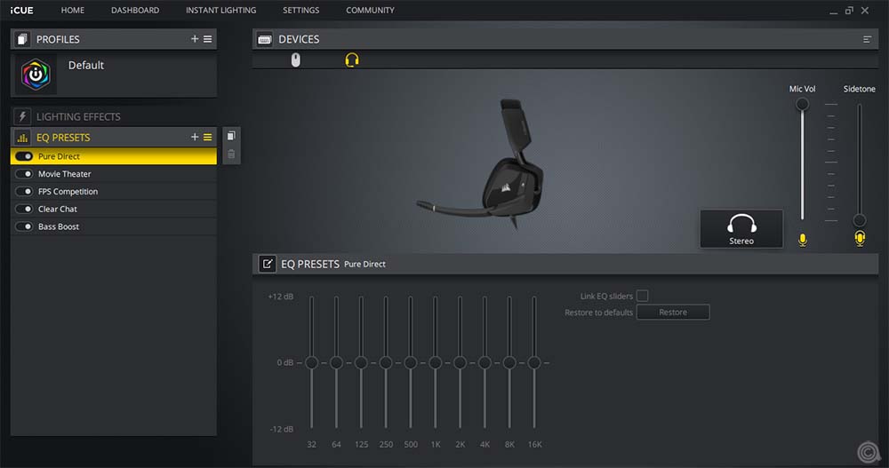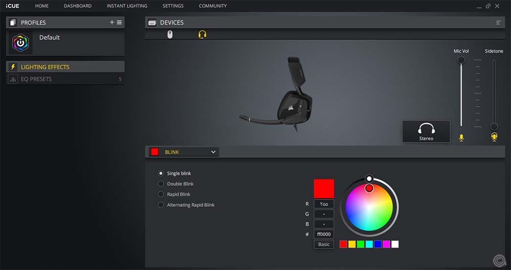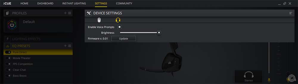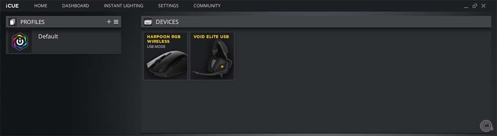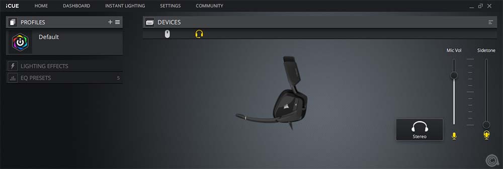 برنامج iCUE متاح في السوق منذ وقت طويل. وبشكل عام تتمتع لوحة التحكم بإحساس بسيط، وما زلت افضل هذا. ويعرض البرنامج أجهزة Corsair المتصلة في القسم العلوي من الواجهة، وتظهر سماعات Void RGB Elite كما ترون. ويتم تحديد المنتج دون أي مشاكل. من السهل التبديل بين الأجهزة بمجرد النقر فوقها.