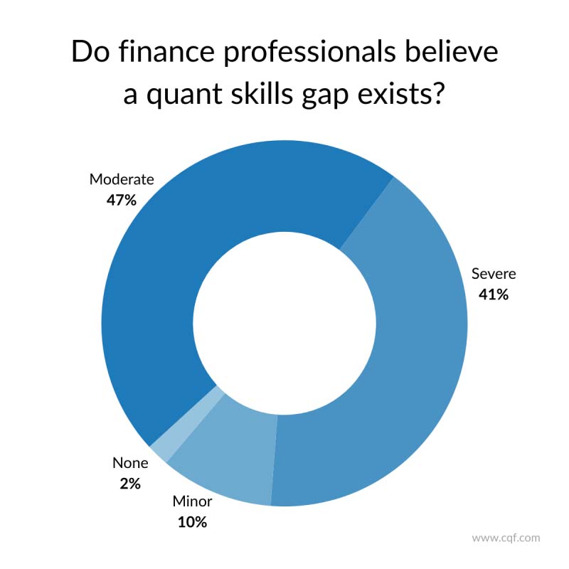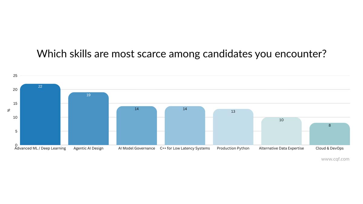 ووفقًا للاستطلاع، يرى 76% من المتخصصين في التمويل الكمي أن الفجوة بين المهارات المطلوبة والكوادر المتاحة قد اتسعت خلال السنوات الأخيرة، مع تزايد الحاجة إلى دمج خبرات الذكاء الاصطناعي مع المهارات الكمية التقليدية.