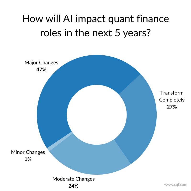 مع دمج الذكاء الاصطناعي في العمليات المالية، أفاد 58% من المشاركين بأن نطاق مسؤولياتهم توسع خلال العامين الماضيين، ليشمل مجالات أكثر تعقيدًا مثل النمذجة الإحصائية والبرمجة وتعلم الآلة. ومن المتوقع أن يستمر هذا الاتجاه، حيث يرى 74% أن الذكاء الاصطناعي سيؤدي إلى تحول كبير أو كامل في وظائف التمويل الكمي خلال السنوات الخمس المقبلة.