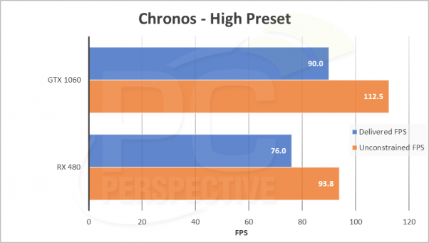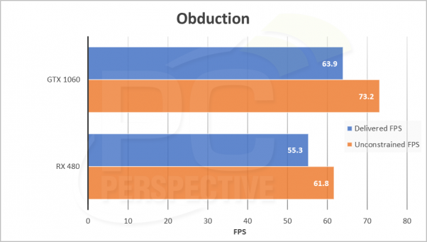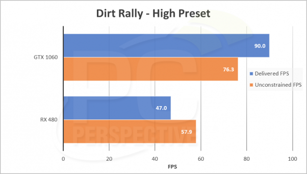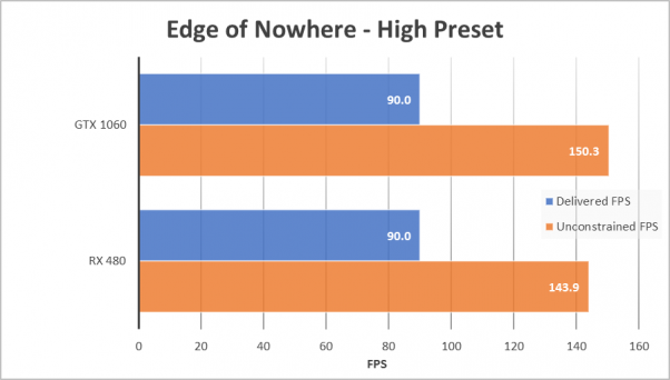 وفي اختبارات موقع PCPer تهزم بطاقة GTX 1060 بطاقة RX 480 باستمرار في كافة تطبيقات الواقعية الافتراضية VR، وبفارق كبير: