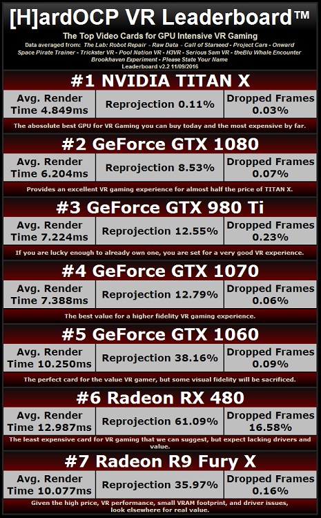 وفي اختبارات موقع HardOCP نري بطاقات NVIDIA متفوقة باستمرار علي بطاقات AMD في 13 لعبة من أصل 18 لعبة اختبرها الموقع، وتلك الألعاب هي: Space Pirate Trainer و Pool Nation و Serious Same VR و The Brookhaven Experiment و Please State Your Name و Raw Data و The Gallery Ep. 1: Call of Starseed و Project Cars و Trials of Tatooine و Robot Repair و Tilt Brush و Island 359 و Onward Mil-Sim.