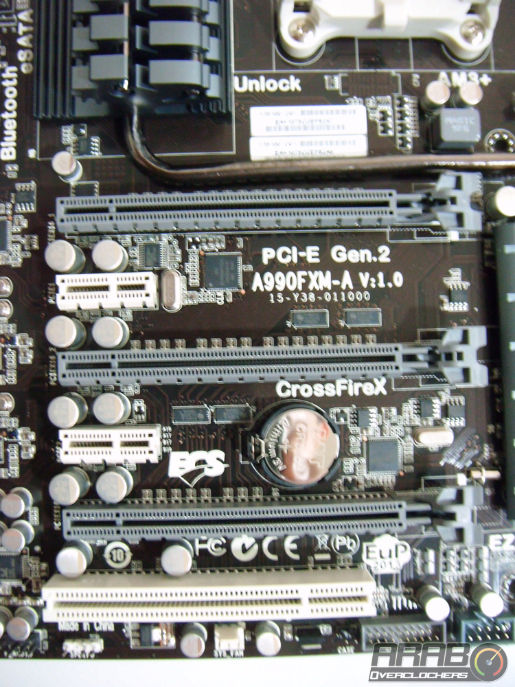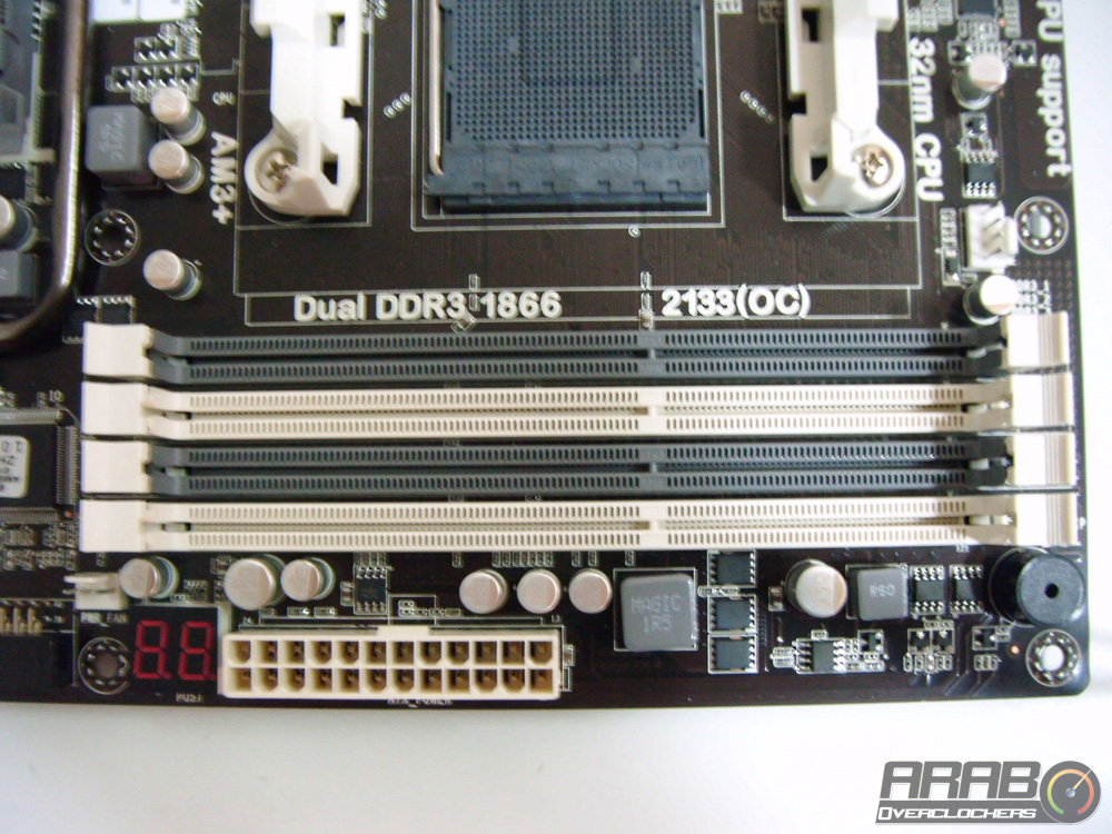 كما نرى فهناك اربعة شقوق مخصصة لتركيب الذواكر من نوع DDR3 ، تدعم خاصية Dual Channel (كما في الجيل الاقدم) ولكن هذه المرة تأتي بدعم تركيب شرائح حتى 8 جيجا بمجموع 32 جيجا لكل الشقوق . تأتي الشقوق باللونين (الرمادي والابيض) للتسهيل على المستخدم حيت تركيب اطقم الذاكرة . تجدر الاشارة هنا ان شركة ECS تنصح باستخدام الشقوق ذات اللون الابيض اولا اذا كان المعالج سداسي الانوية او اكبر والشقوق ذات اللون الاسود اذا كان المعالج المستخدم ثنائي او رابعي الانوية للحصول على افضل واعلى اداء . وكما سبق وذكرنا فقد استخدمت ECS دوائر طاقة رقمية للذواكر كما في المعالج لضمان ثابت تام عند رفع ترددات التشغيل ، وقد نوهت الشركة بأن اقصى تردد للذواكر هو 2133 ميجاهرتز .
