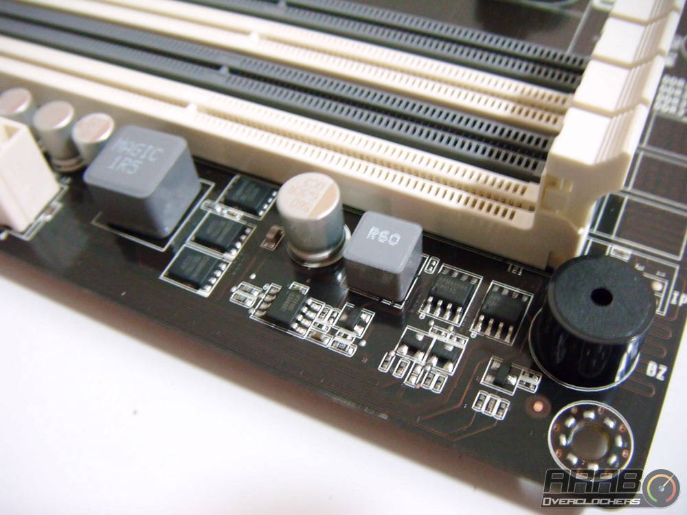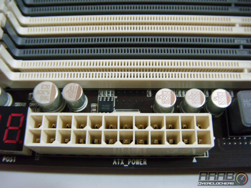 وبالاسفل نجد مقبس تزويد اللوحة بالطاقة 24 بن (ابرة) ، وهذا المقبس معياري في جميع اللوحات الام كما نرى السماعة التي تنبهنا بالاخطاء مدمجة في اللوحة .