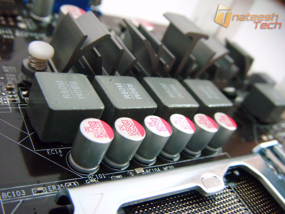 وهنا تظهر بوضوح المكثفات الصلبة Solid Cap و SFC وخلفهم المشتت الصغير (غريب التصميم) المتواجد على ال Phase حتى تشتت الحرارة الصادرة منها ، وتعتمد اللوحة معيار VRD 12 Voltage Regulator Down لتحسين عملية امداد المعالج بالطاقة اللازمة تحت كل الظروف ، كما يساعد ايضا تقليل الطاقة في حالة عدم عمل المعالج.