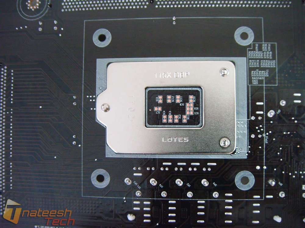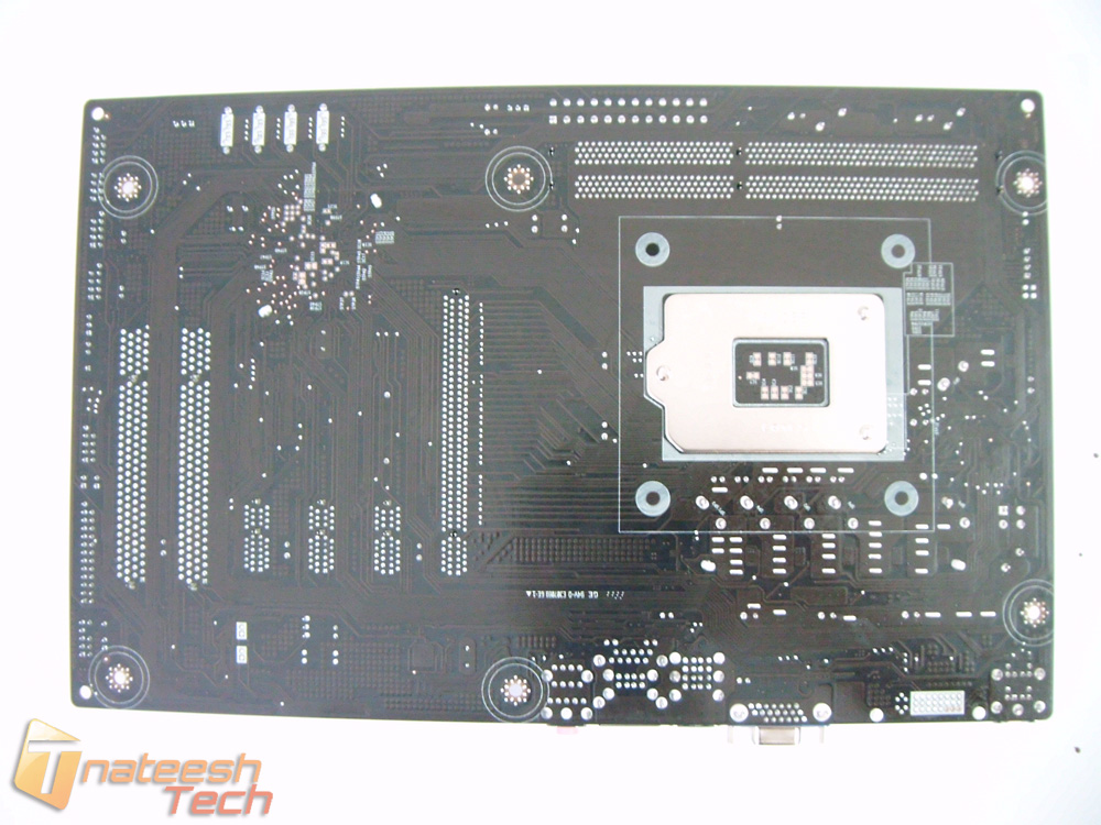 الجهة الخلفية للوحة ،لا يوجد الكثير للحديث عنه فهناك القطعة الحديدة شبه المربعة وهي المسئولة عن تثبيت مقبس المعالج ، كما تظهر بوضوح فتحات تثبيت اللوحة بداخل الصندوق (ستة فتحات) ، بالاضافة الى فتحات تثبيت المشتت فوق المعالج .