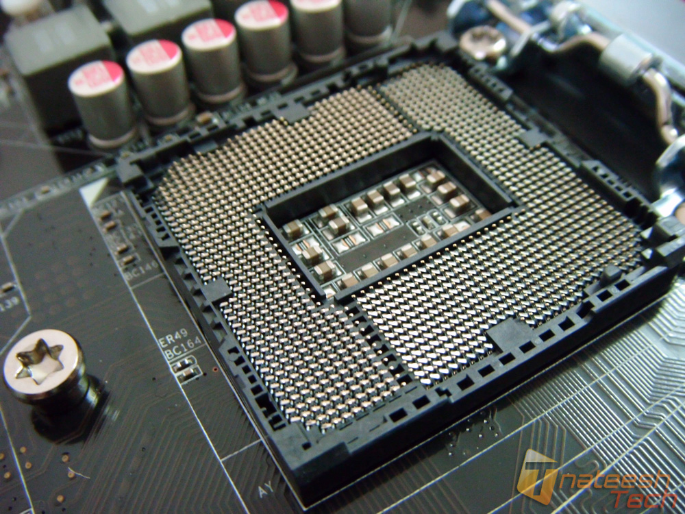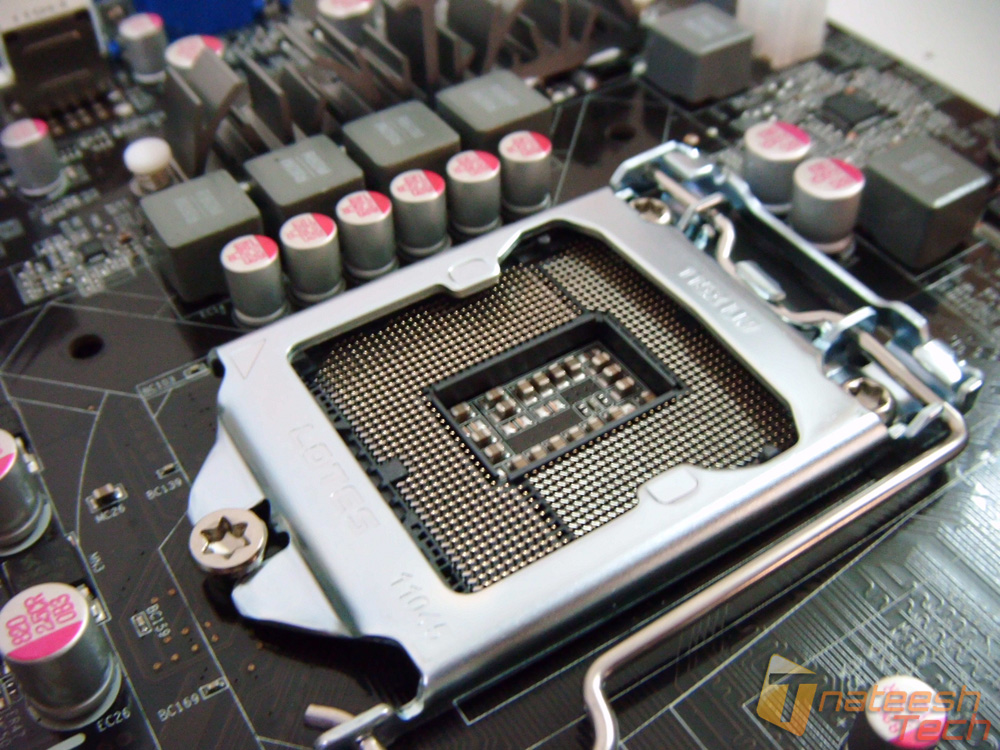 في الصورة السابقة يظهر لنا مقبس المعالج الجديد المزود ب 1155 ابرة (سن) ، وهو ينقص بسن واحد عن المقبس الذي سبقه 1156 . كما لا يمكن ابدا تركيب معالج بمقبس 1156 على هذا المقبس (هذا الخطأ يتلف المقبس تماما) . والجدير بالذكر ان شركة ECS قامت بطلاء جميع ابر المقبس بالذهب من عيار 15 قيراط حتى تتحمل هذه الابر (الاسنان) اقصى درجات كسر السرعة دون الخوف من تلفها (كما شاهدنا في لوحات من شركات اخرى) ، جميع مقابس للوحات شركة ECS لجيل ساندي بريدج مطلية بالذهب (احيي الشركة على هذه الاضافة) .