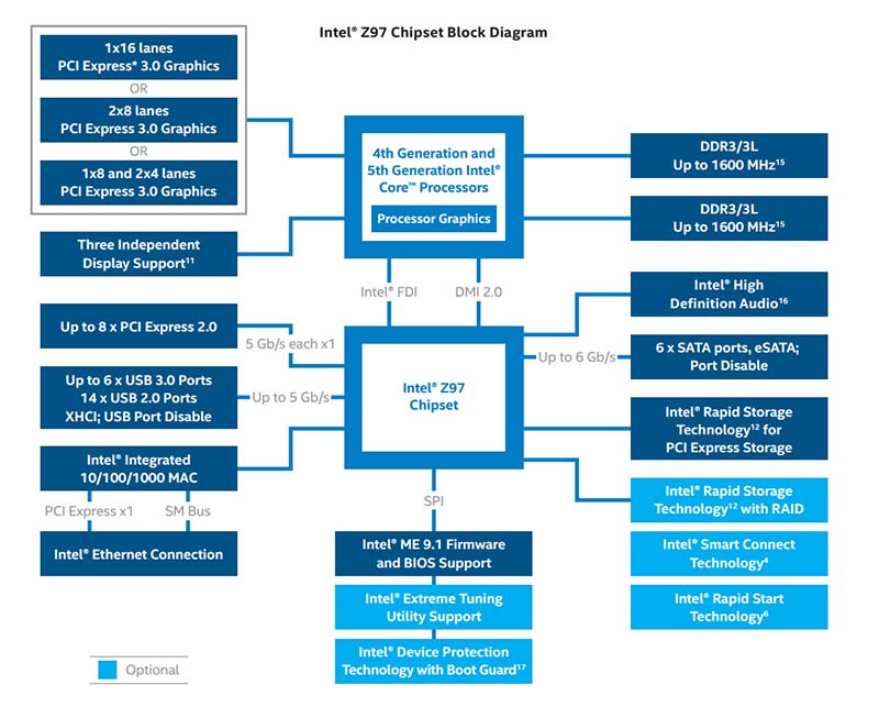 تتشابه شريحة Z97 مع سابقتها Z87 فى كثير من الأوجه ,حيث أنها تقدم نفس عدد منافذ ال SATA III و USB3.0 , و نفس عدد ممرات ال PCI-E2.0 ولكن تكمن أوجه الإختلاففى واجهات التوصيل, حيث أنها تستخدم ممرين من ممرات PCI-E2.0 التى تقدمها الشريحة لمنفذ M.2 وهو أحد المميزات الجديدة المعدلة عن شرائح الجيل السابق و توفر واجهة التوصيل M.2 سرعة نقل البيانات تصل حتي 1GB/s .
