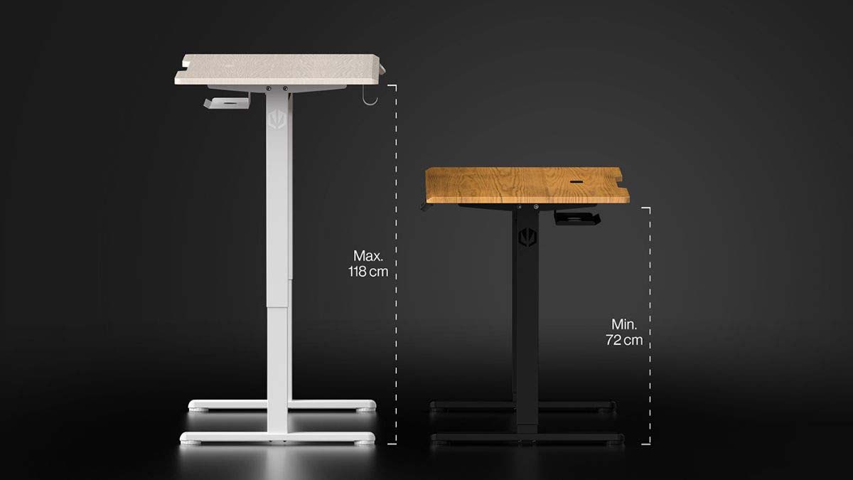 ويتيح نظام الرفع الكهربائي ضبط الارتفاع بدقة مع حفظ ما يصل إلى 3 إعدادات، بمدى ارتفاع من 72 إلى 120 سم لطراز L ومن 72 إلى 118 سم لطراز S، ما يجعل التبديل بين الجلوس والوقوف مريحًا وسريعًا.