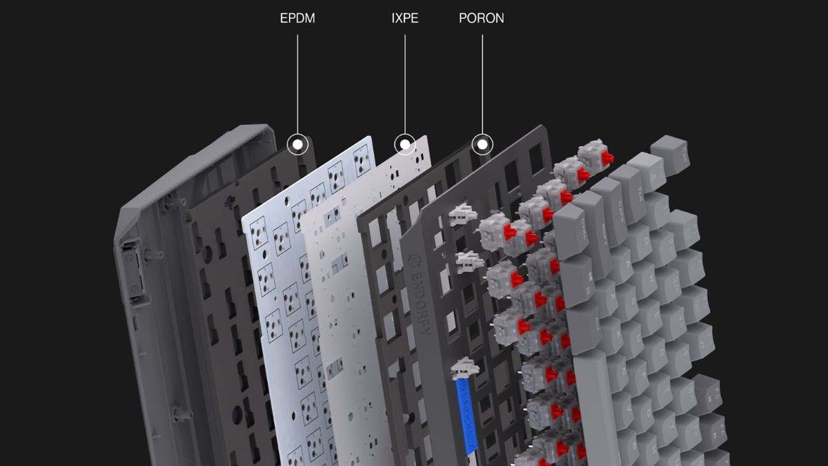 تمتاز لوحات المفاتيح بثلاث طبقات من الفوم الصوتي (PORON، EPDM، IXPE) مع ممتصات اهتزاز إضافية أسفل زر المسافة، ما يمنح كل نقرة إحساسًا دافئًا وصوتًا ممتعًا. الهيكل مصنوع من الألمنيوم عالي الجودة لضمان المتانة والثبات حتى بعد سنوات من الاستخدام.