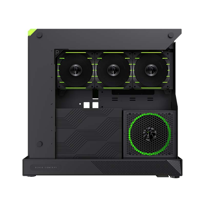 يدعم BLADE CONCEPT اللوحات الأم حتى ATX، مع وصلة PCIe 4.0 PCIe Riser مدمجة لتركيب بطاقات الرسومات عموديًا. يدعم الهيكل مشعات تصل إلى 360 مم، وهو مثالي للتبريد السائل المُخصص.