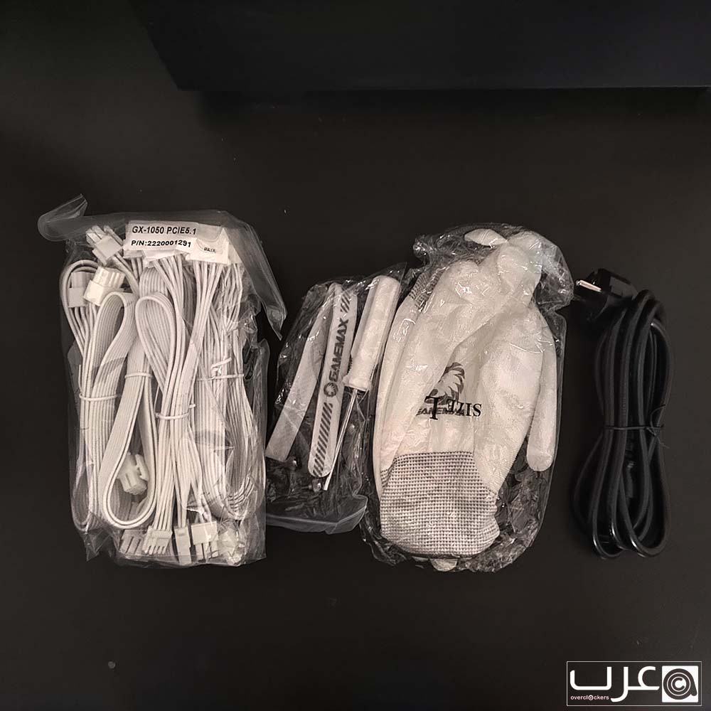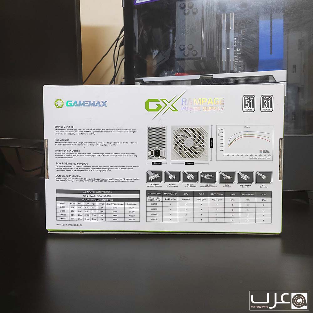 وصلتنا الوحدة في عبوتها المميزة بتصميمها الأخضر والأبيض المميز لعلامة GAMEMAX. وتبرز على الواجهة الأمامية مجموعة من المواصفات التقنية البارزة، بما في ذلك تصنيف الطاقة العالي وشهادتي ATX 3.1 وPCIe 5.1، مما يعكس جودة المنتج ومطابقته لأحدث المعايير.