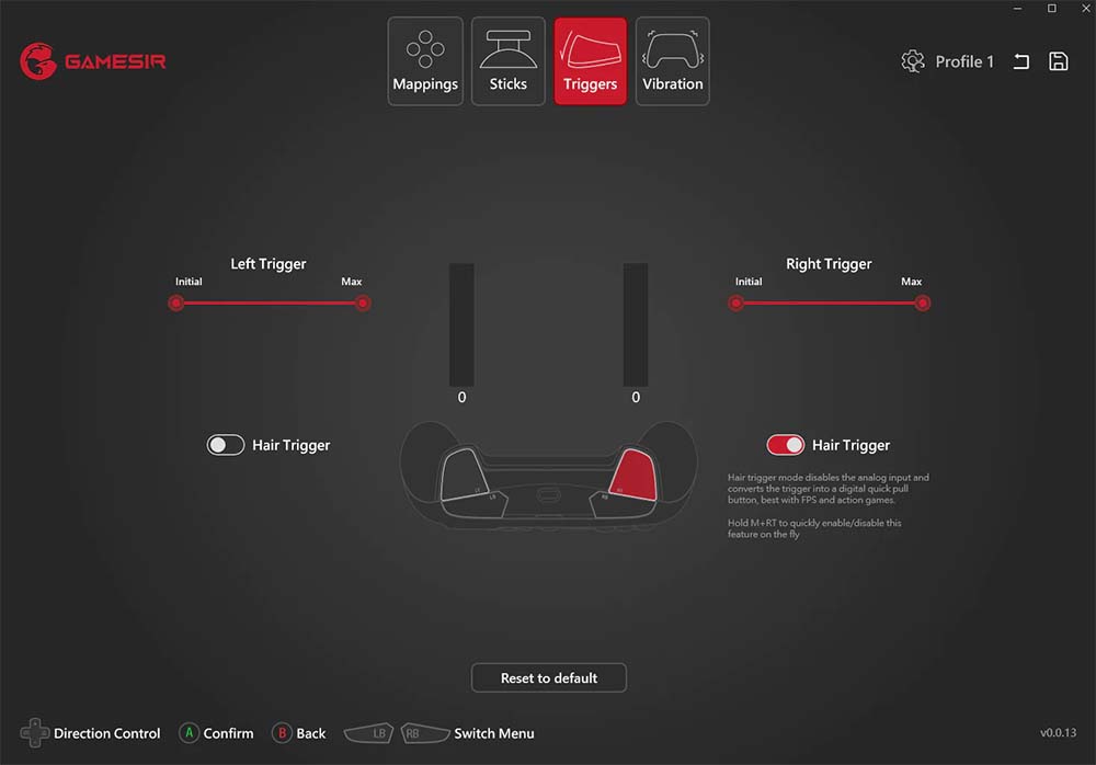 هناك ميزة أخرى فريدة لوحدة تحكم GameSir G7 وهي القدرة على تكوين عمل كل مفتاح تقريبًا من وحدة التحكم ويمكن تحقيق ذلك باستخدام تطبيق GameSir Nexus المتاح في متجر Microsoft للـ Xbox و Windows. الواجهة بسيطة والخيارات مباشرة. يمكنك الحصول على إمكانية تحديث البرنامج الثابت، والتحقق مما إذا كانت الاهتزازات تعمل، ويمكنك إعداد ثلاثة ملفات تعريف كحد أقصى. يتضمن التكوين في كل ملف تعريف تعيين معظم الأزرار وضبط نصف قطر مناطق عصي التحكم. ,باستخدام هذا التطبيق، يمكنك إنشاء ملفات تعريف متعددة لوحدة التحكم والتبديل بينها ، وإعادة تعيين كل زر على حدة على وحدة التحكم (باستثناء الزر “M”). إنه سهل الاستخدام، ويشعر بالثقة، ولا ينقصه أي من الميزات التي كنت أتوقع توفرها.