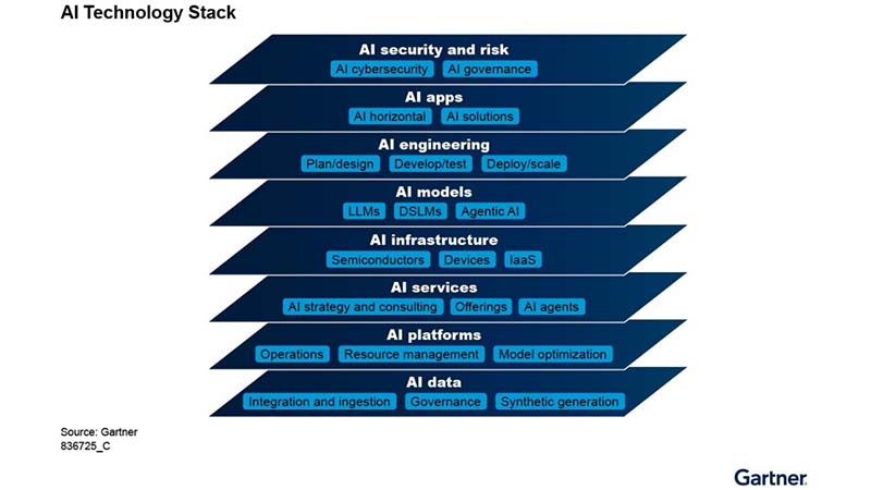 وتقوم جارتنر بتسليط الضوء على المزودين الذين من المتوقع أن ينجحوا في نهاية هذا السباق بدءاً من كبار المزودين مروراً بالمنافسين الصاعدين ووصولاً إلى اللاعبين الجدد في القطاع، وذلك بالتزامن مع تسابق العديد من مزودي خدمات الذكاء الاصطناعي في كامل بنية تكنولوجيا الذكاء الاصطناعي (انظر الشكل 1).