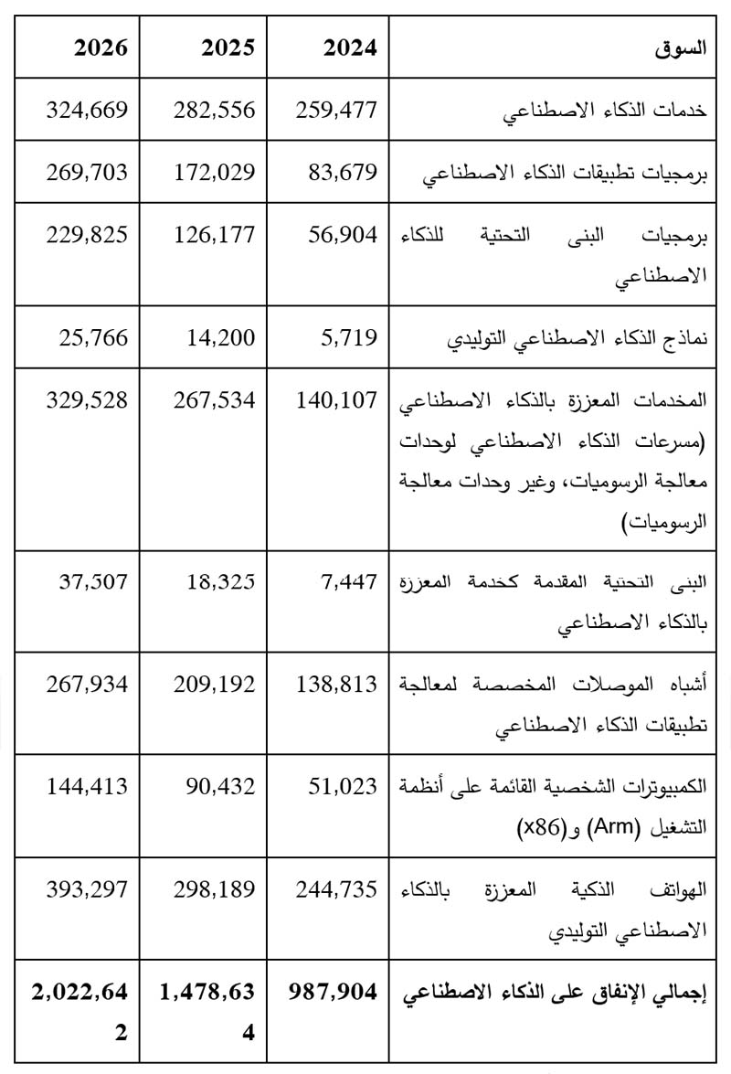 الإنفاق على الذكاء الاصطناعي في أسواق تكنولوجيا المعلومات في جميع أنحاء العالم، 2024-2026 (الأرقام بملايين الدولارات الأمريكية)