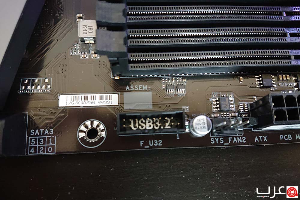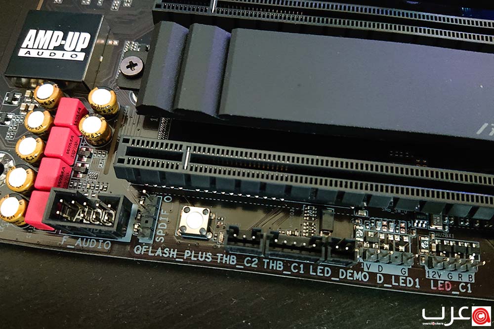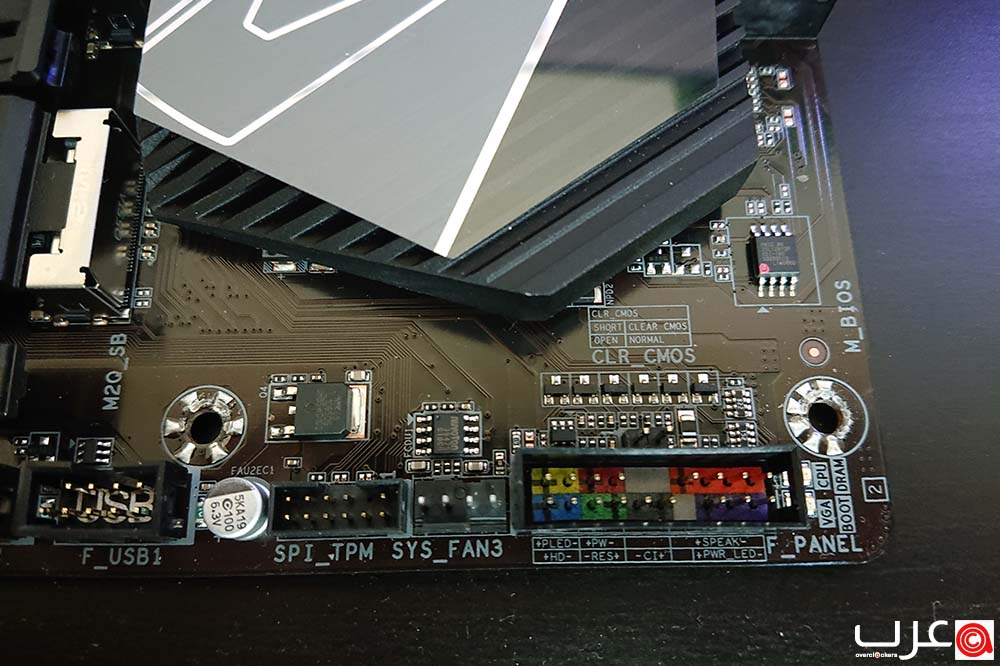 لا تحتوي B460 AORUS PRO AC على ازرار تشغيل وبدء سريع DIY هذه المرة، لذلك تحتاج إلى استخدام توصيل كابلات الصندوق لتشغيلها. بجانب اسنان توصيل الازرار يوجد منف توصيل مروحة تقليدي ومنفذ توصيل SPI، والتي تُستخدم لتوسيع وحدة تشفير TPM، وهو أمر بالغ الأهمية لبعض أجهزة الحاسب التي تتطلب السرية.