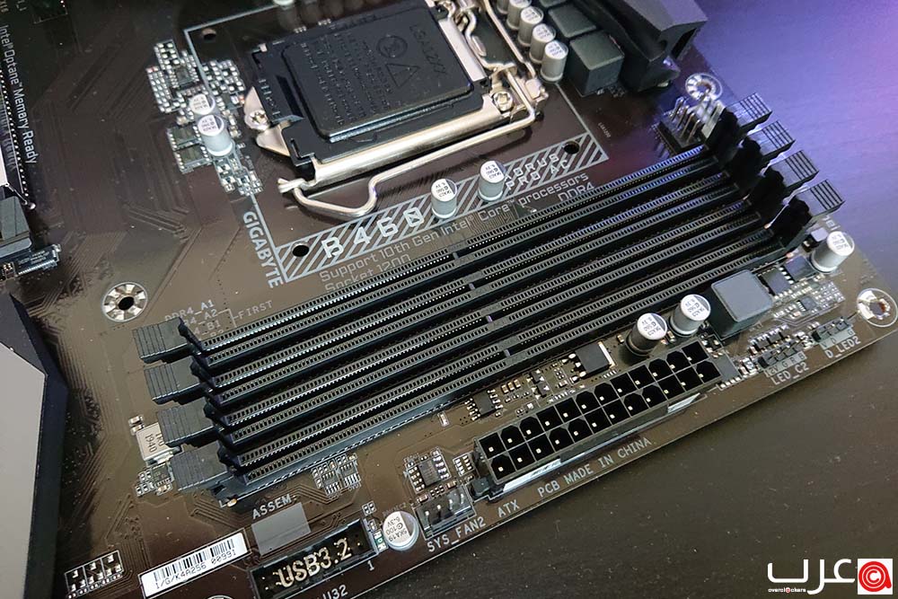 وتحتوي B460 AORUS PRO AC اربعة منافذ لذاكرة DDR4 هذه المرة، وتدعم القنوات المزدوجة، مع دعم تردد 2933 ميجاهرتز، وتقنية XMP.