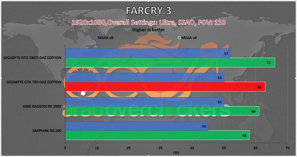 تساوت البطاقتين GTX 780 و R9 290X عند تفعيل MSAA حتي 8X والفارق بينهم في حال تفعيل MSAA 4X ضئيل لصالح GTX780.